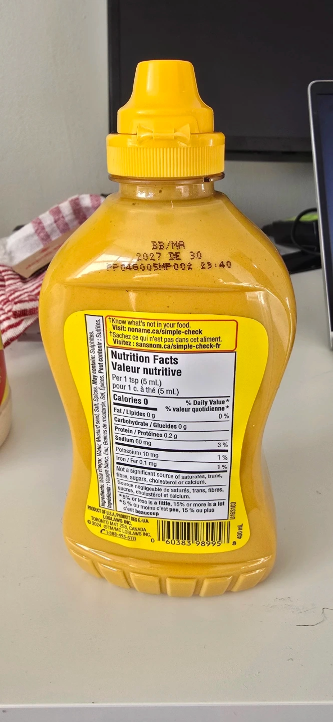 A 400mL bottle of No Name prepared yellow mustard. It's a staple for hot dogs and sandwiches. This mustard is great for everyday use.