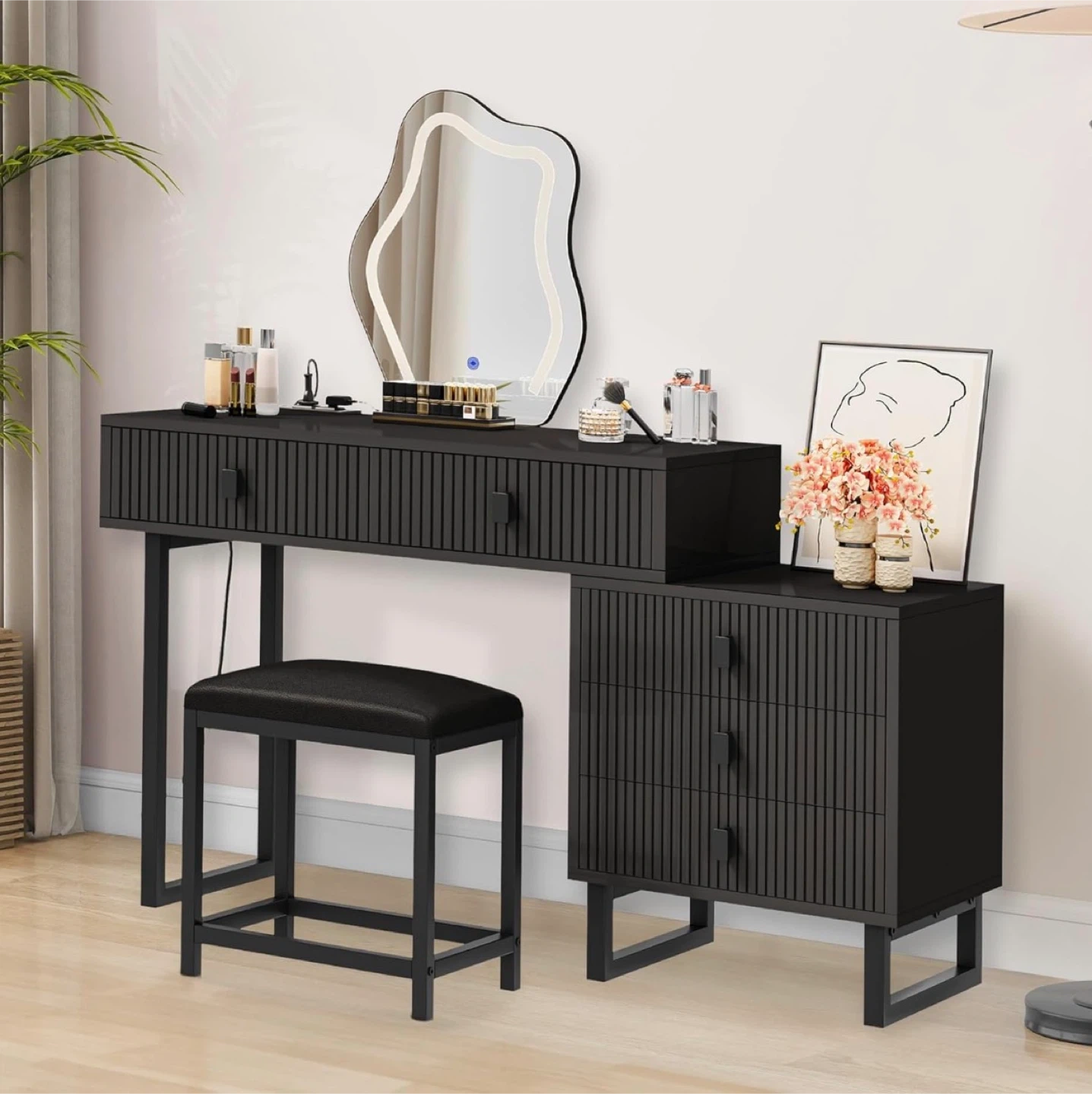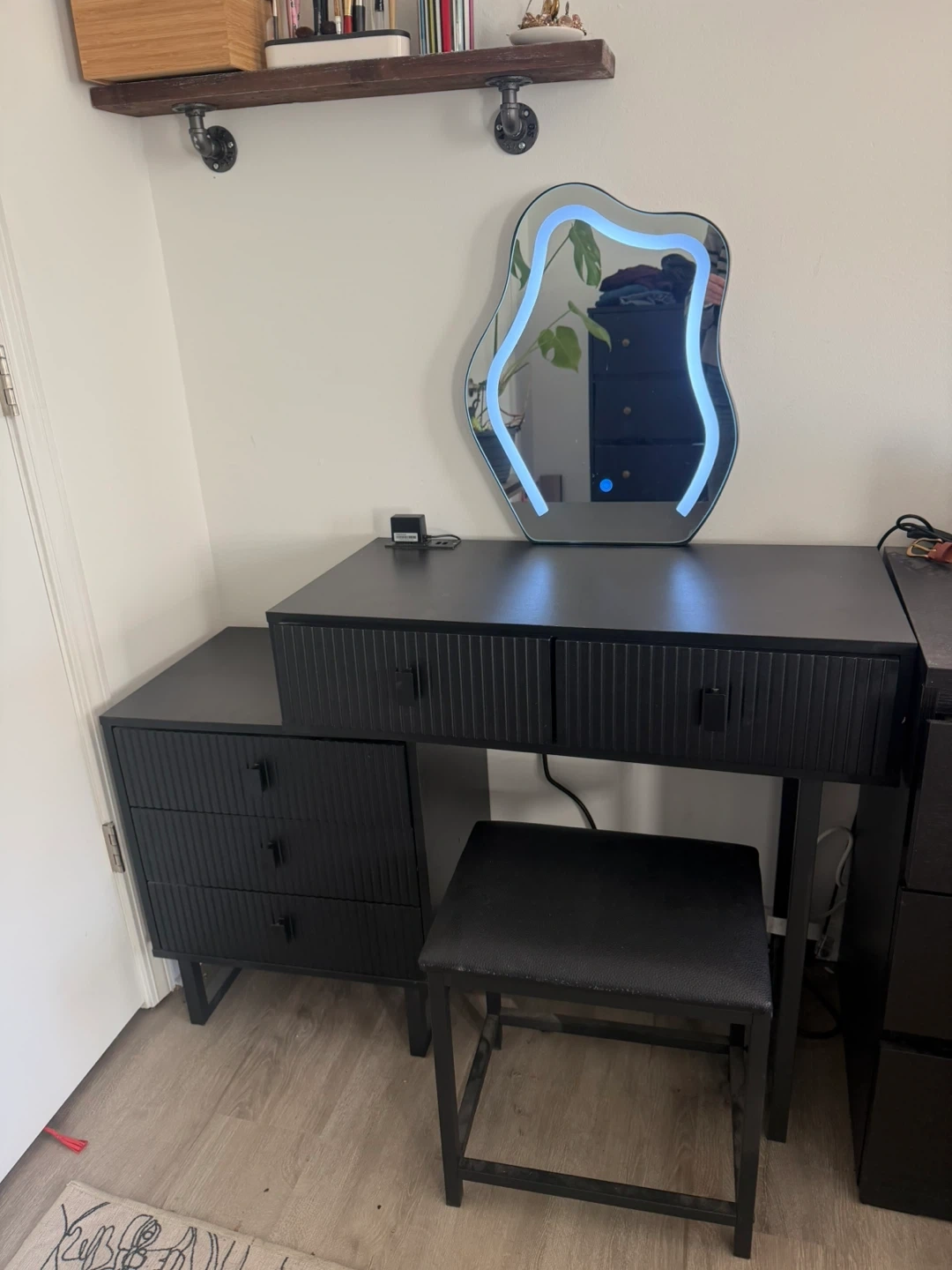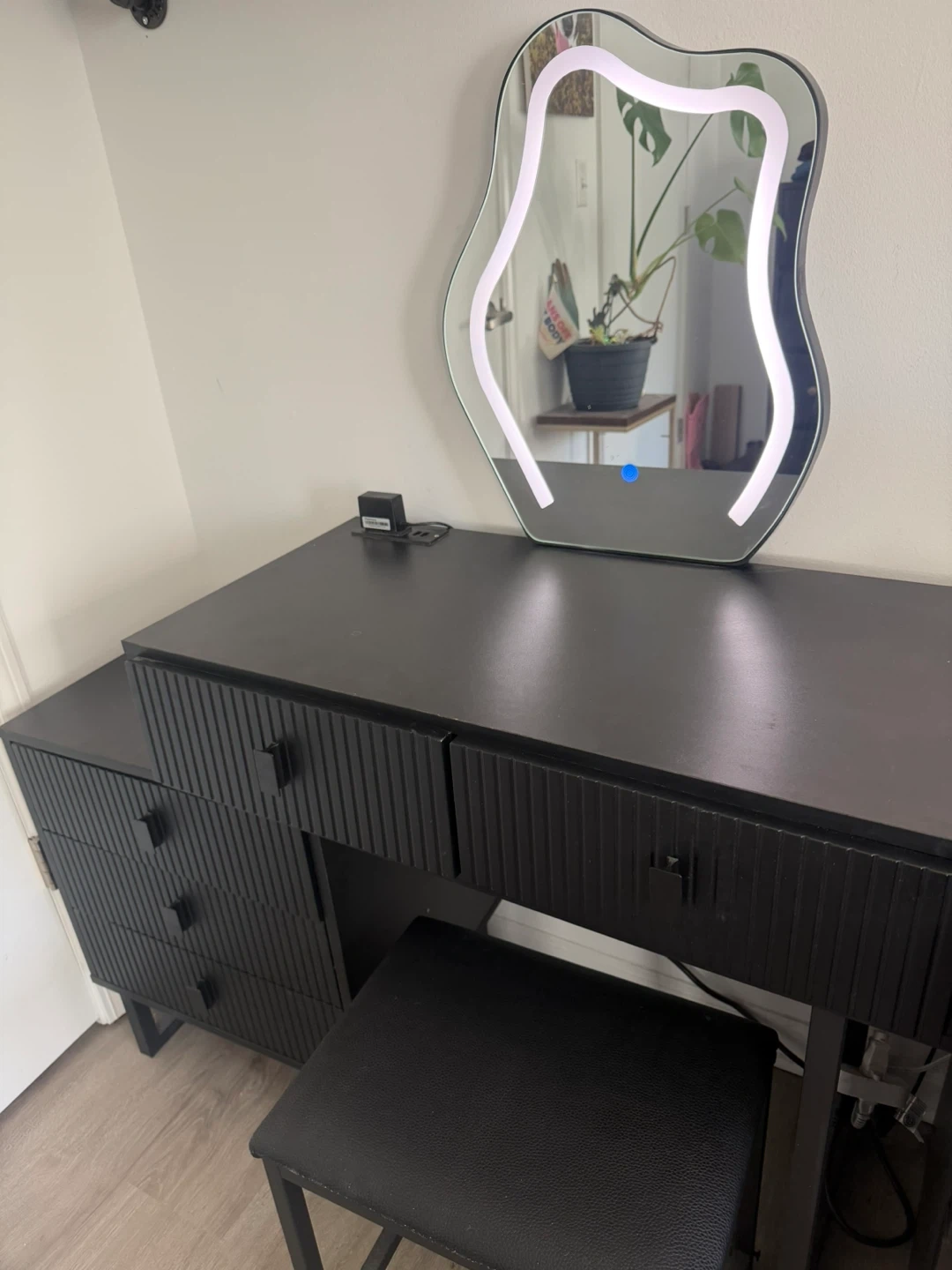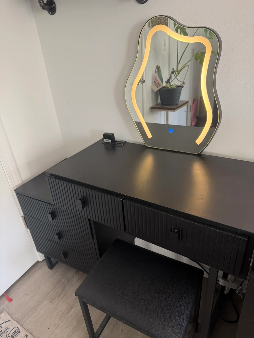Selling a sleek black vanity desk set! It comes with a unique shaped mirror with LED lighting and a matching stool. The desk has 5 drawers for storage, electric outlets for charging, perfect for organizing your makeup and accessories. It's in great condition and ready for a new home!