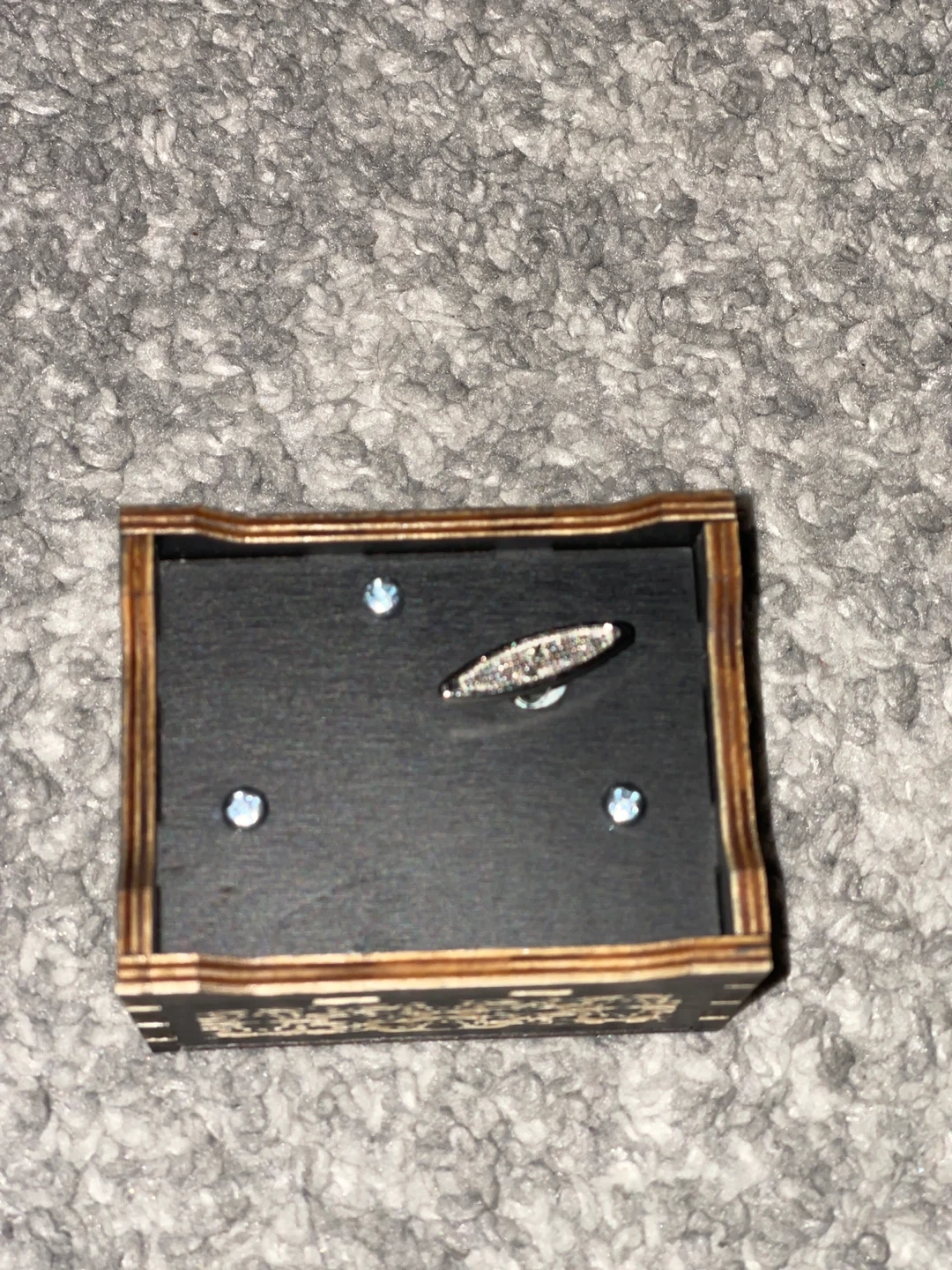 This music box features a 'Davy Jones Locket' design with decorative wood carvings. It contains a music mechanism with a cylinder and comb for playing music.