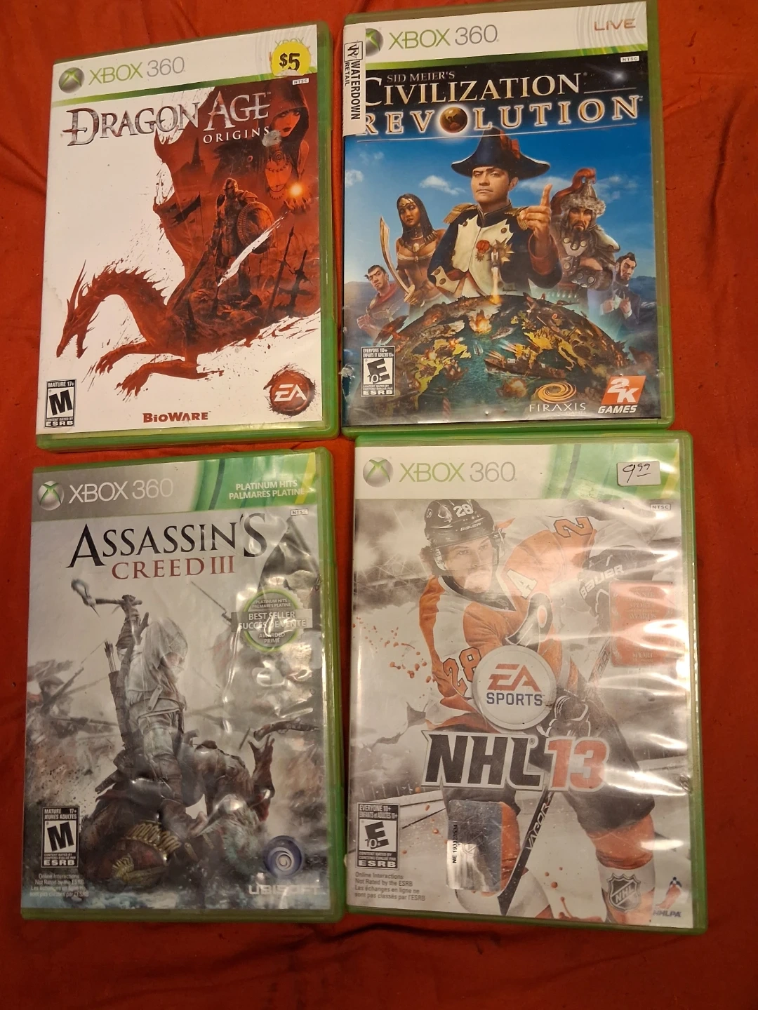 Four Xbox 360 video games included are Dragon Age: Origins, Sid Meier's Civilization Revolution, Assassin's Creed III, and NHL 13. These games are rated M for Mature 17+ and E10+ for Everyone 10+ by ESRB. NHL 13 is a Platinum Hits title.