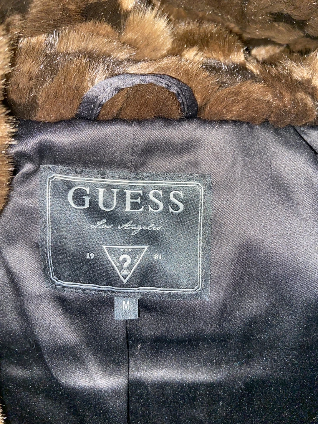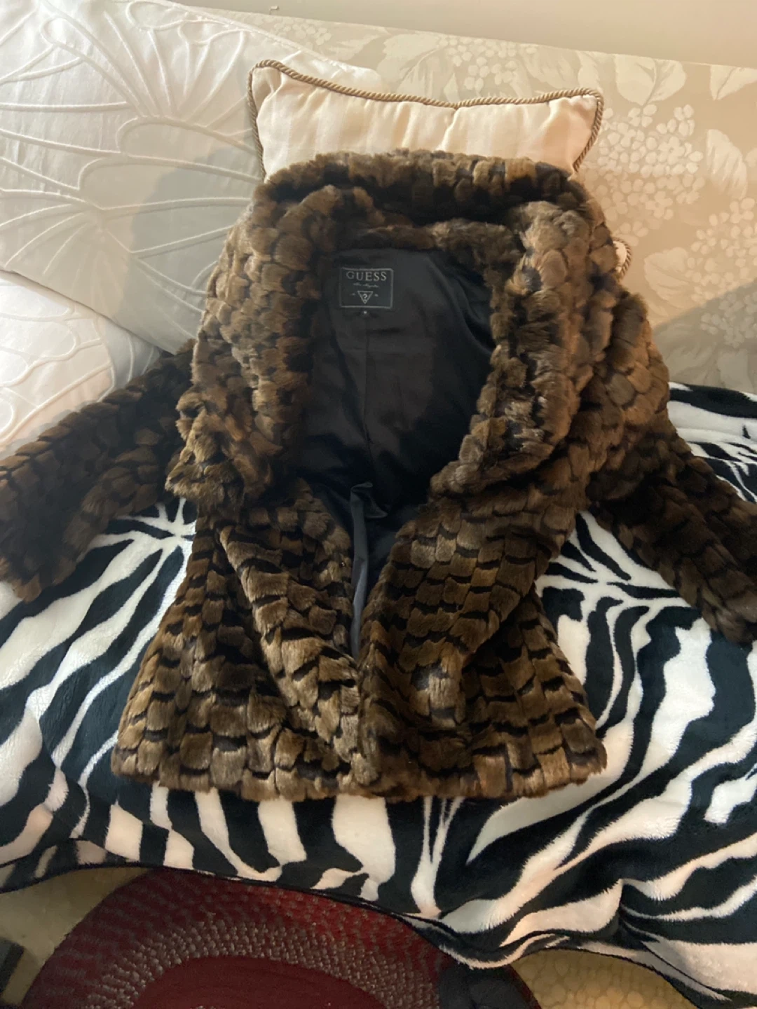Brown and black patterned faux fur jacket from Guess. It's a size medium with a silky black lining. This stylish jacket is perfect for cooler weather! A picture of the front and back