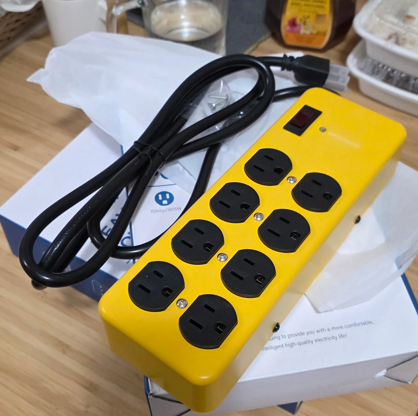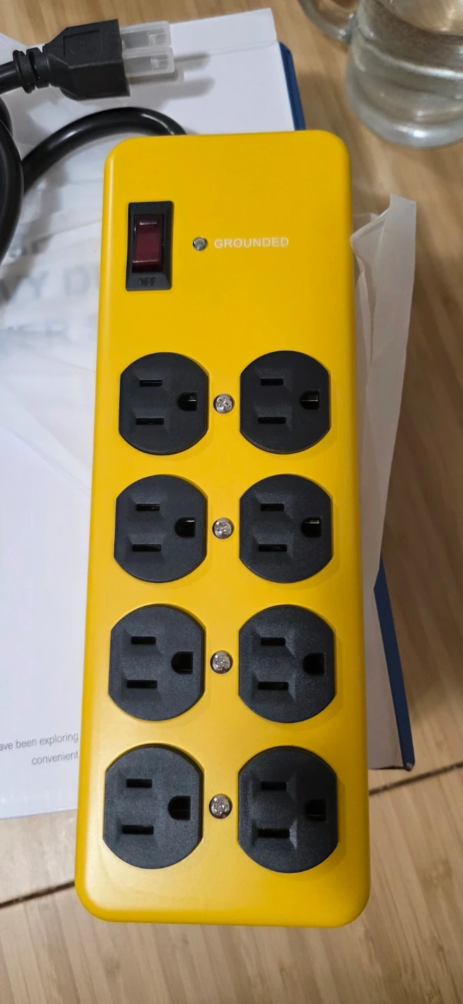 Yellow 15 amp heavy duty power strip with 8 grounded outlets. Features surge protection and a 6ft power cord. Metal construction for durability.
