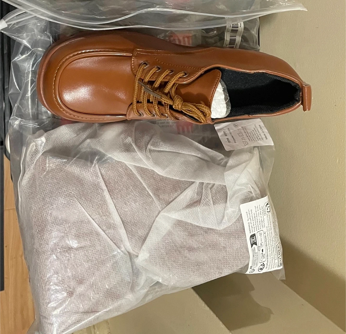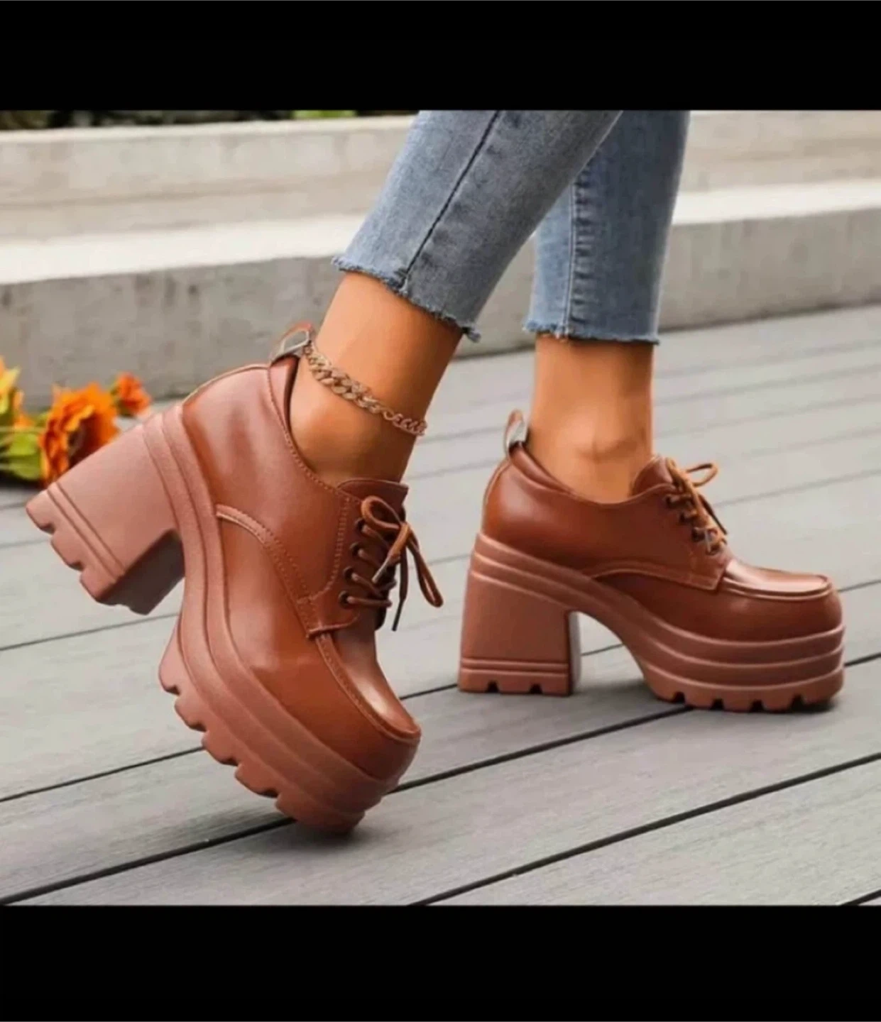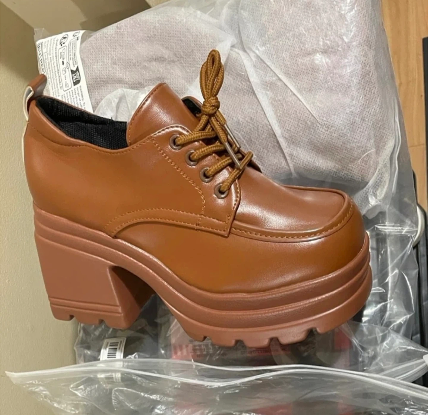 Women’s size 7.5, brown platform oxford shoes feature a classic lace-up design. They have a stacked heel and a thick sole, perfect for adding some height. Faux leather material.