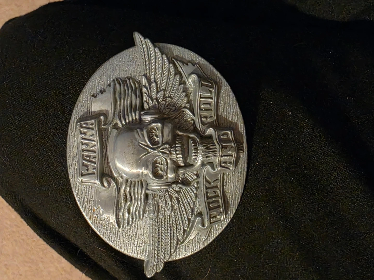 I Wanna Rock and Roll" Skull & Wings Belt Buckle