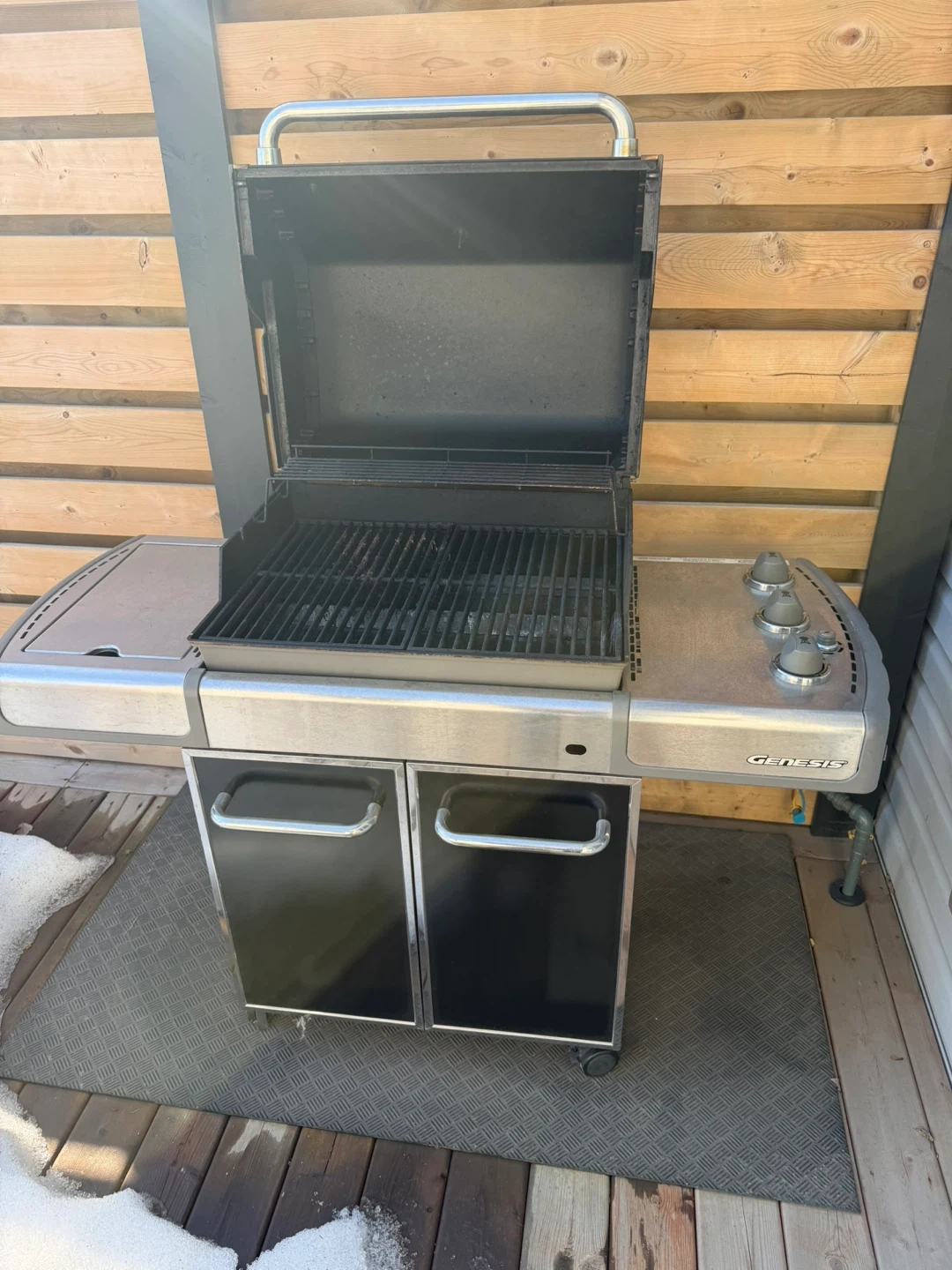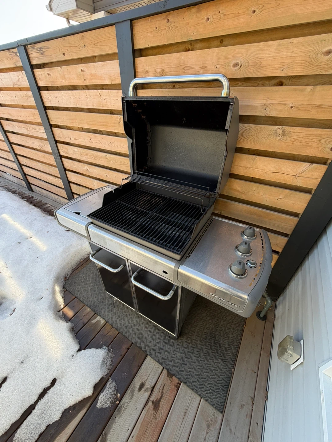 Weber Genesis gas BBQ grill. Stainless steel construction with side shelves and storage cabinet. Perfect for backyard cooking during the warmer months!