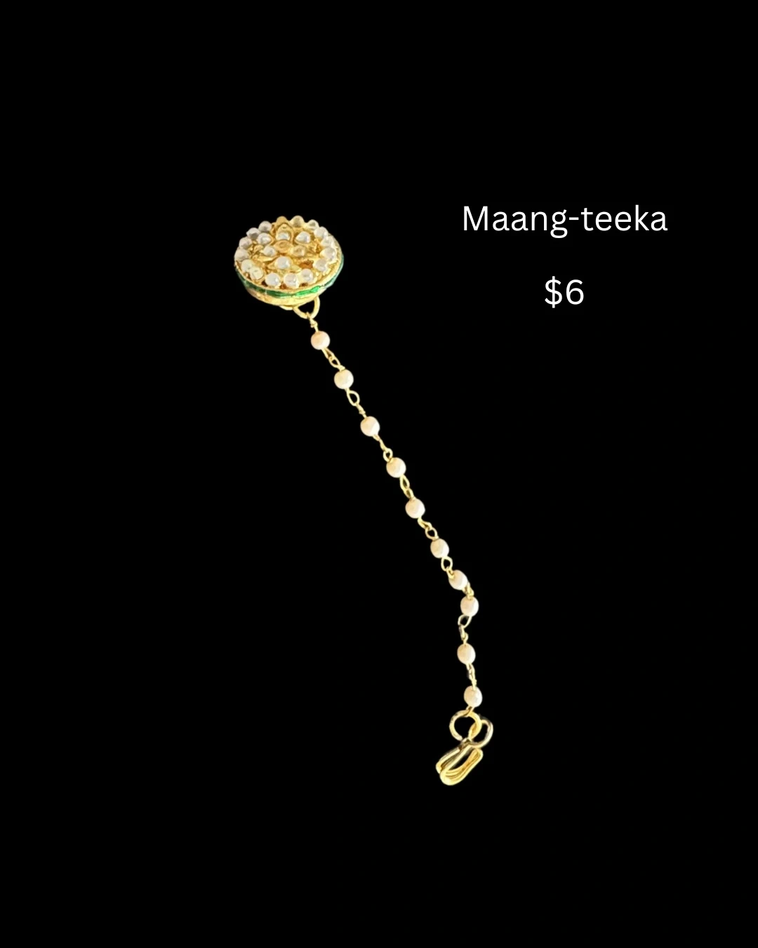 A maang teeka adorned with small pearls and a central floral design. It has a delicate chain with a clip closure. This piece is perfect for adding a touch of sparkle to traditional outfits.