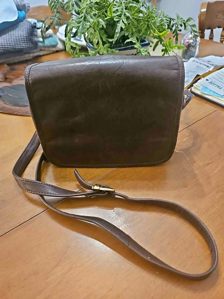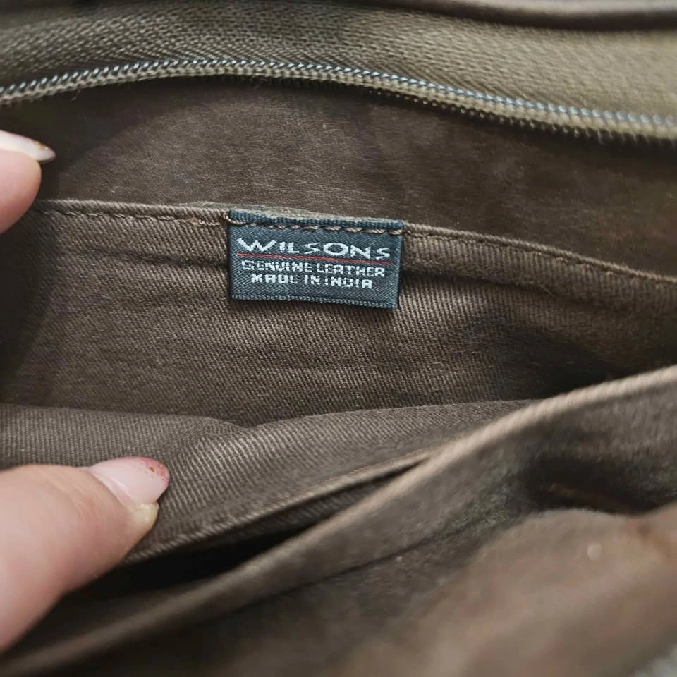 Wilson’s genuine leather crossbody bag in rich dark brown. Soft genuine leather. Features: Adjustable leather strap, front snap pocket, interior zip pocket, top zip closure, card slots. Lightweight everyday size. Good used condition with normal wear consistent with leather. All zippers and snap closures work properly. Comfortable worn crossbody or on the shoulder. Pick up Langley 208 & 57. Non smoking home.