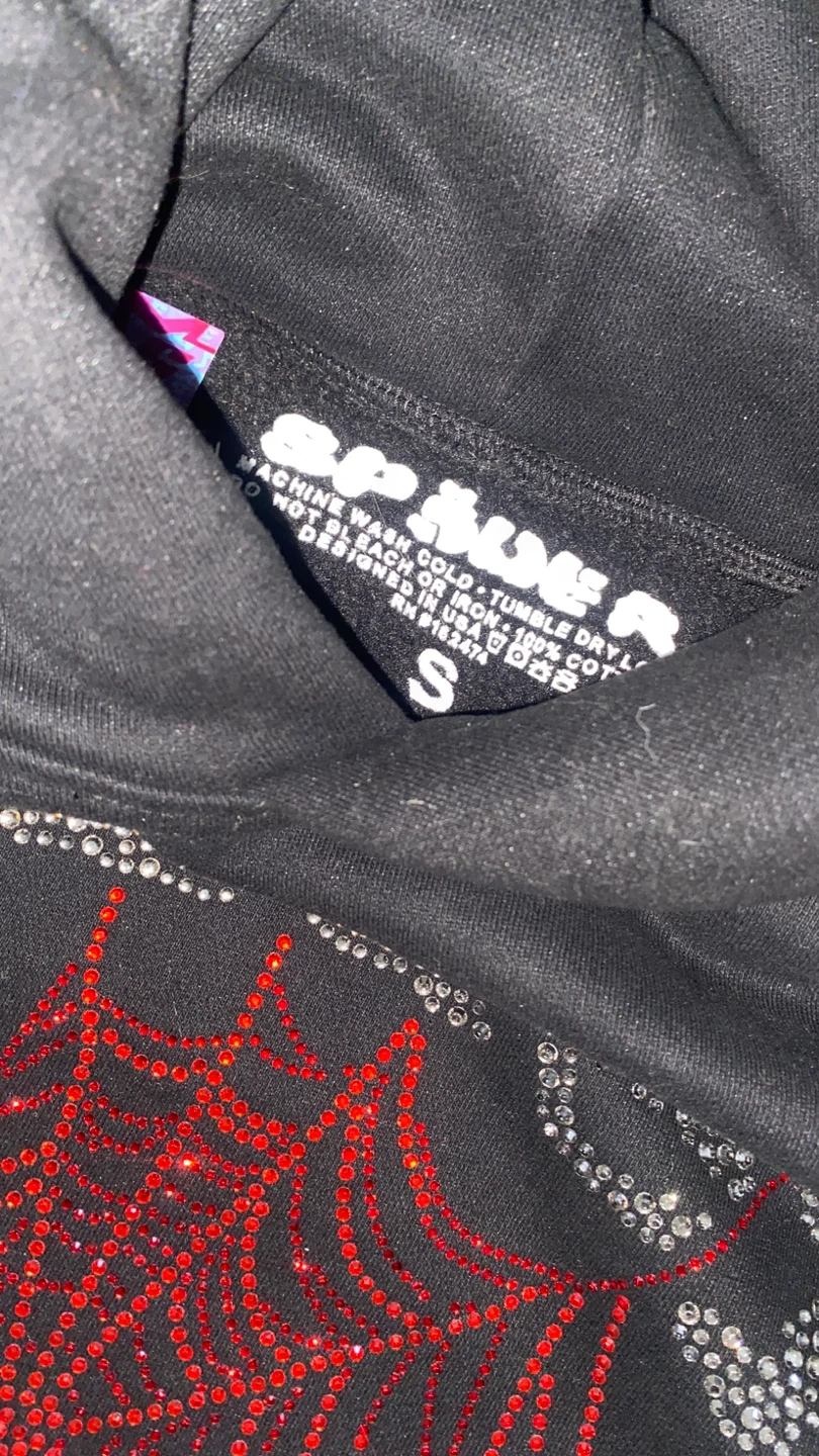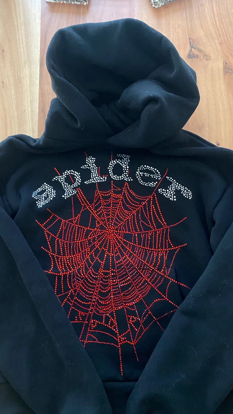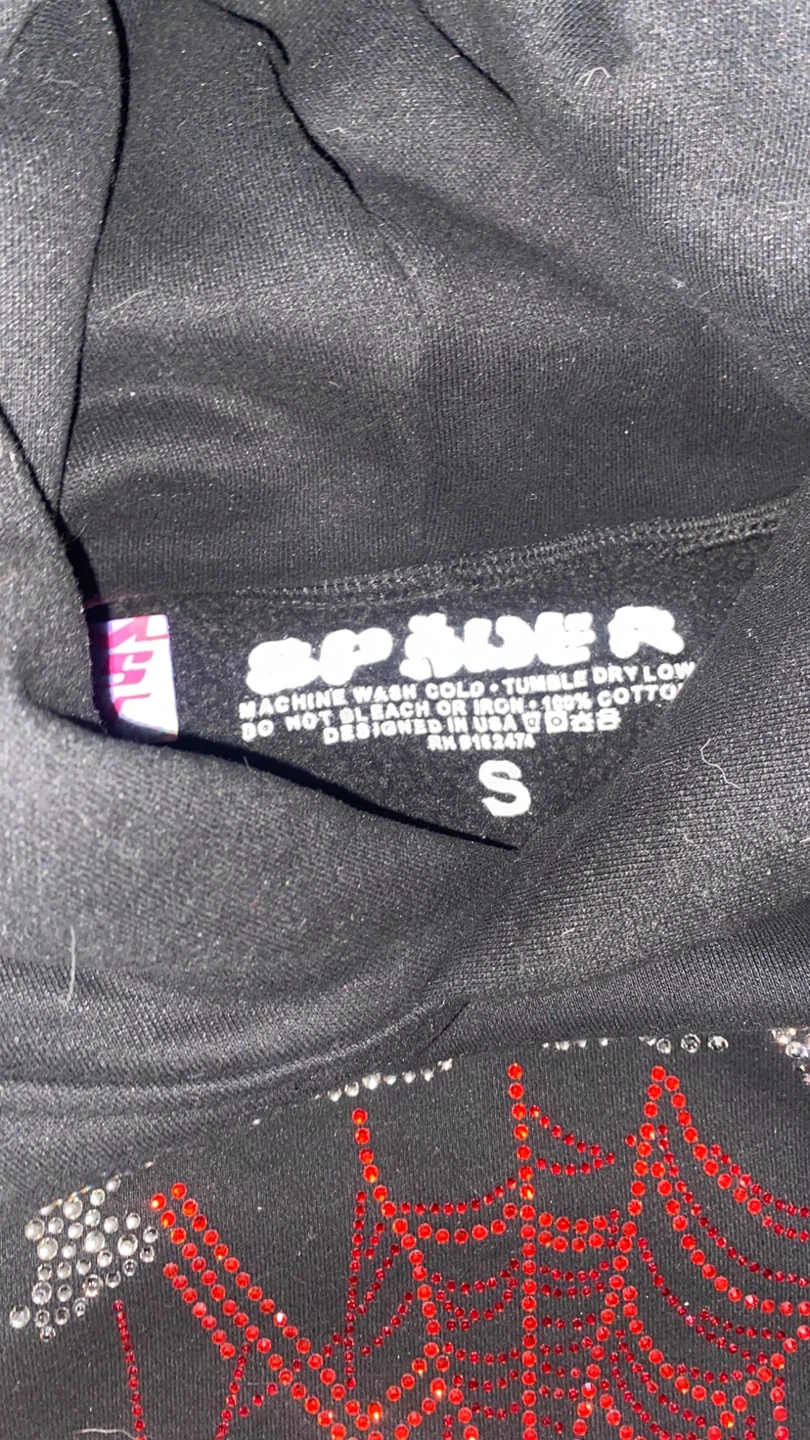 Spiderworldwide hoodie in black. Features a rhinestone spiderweb design on the front. Made of 100% cotton. Size S. Machine wash cold, tumble dry low. Do not bleach or iron.