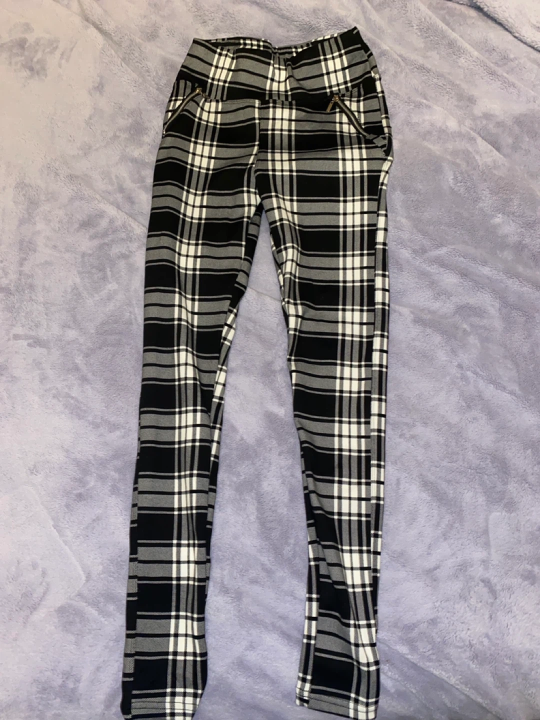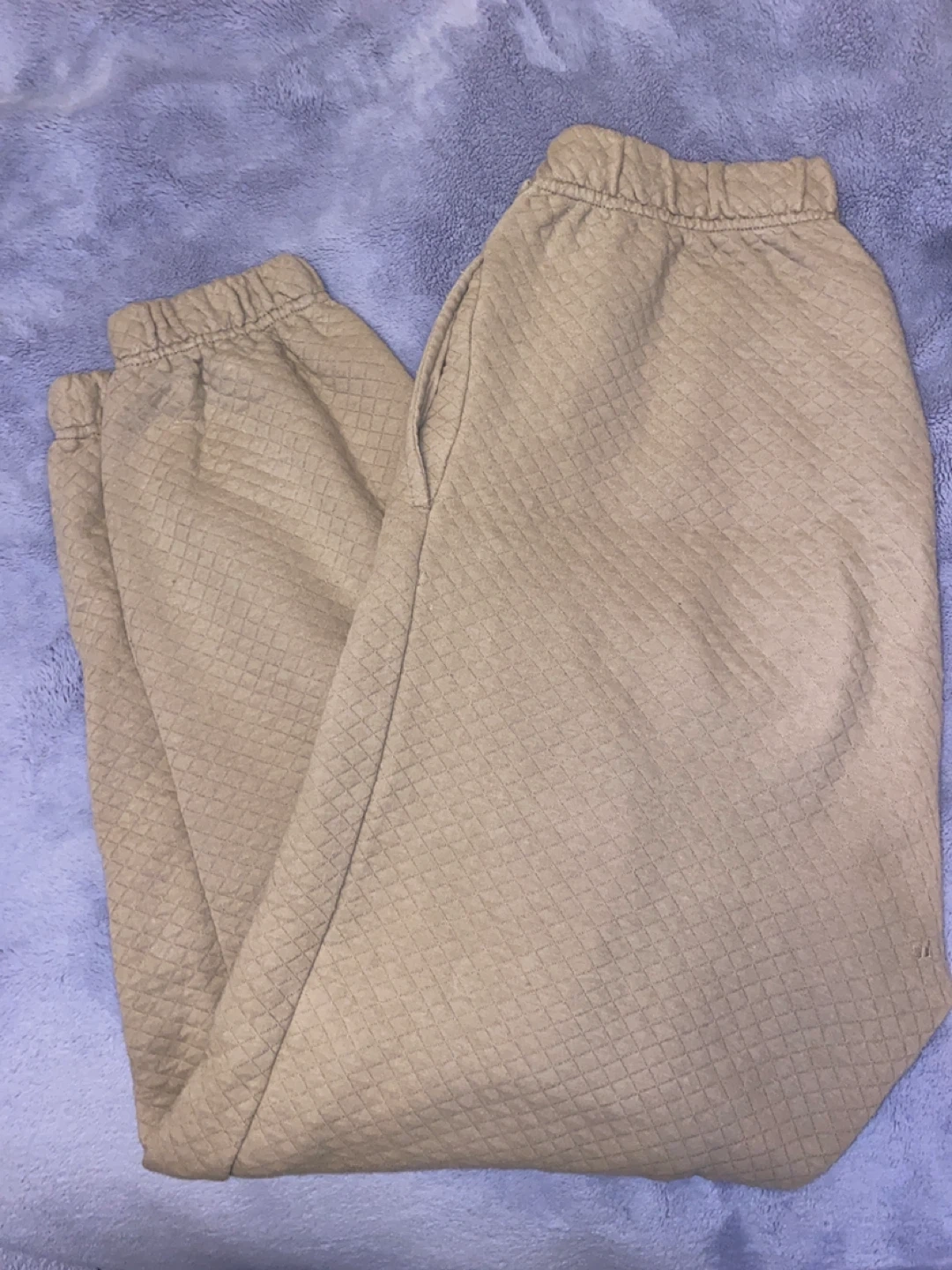 Bundle includes 5 pairs of pants. One pair has a black and gold celestial pattern. Another has a vibrant floral print on black. There's a black and white plaid pair with zippered pockets. A quilted tan pair of joggers. And a pair of blue and black striped pyjama pants with the top and a comfy hoodie.