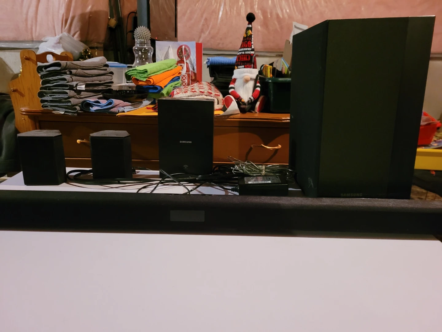 This Samsung 5.1 channel soundbar system includes a soundbar, subwoofer, and two satellite speakers. It's designed to enhance your audio experience. Manufactured in 2015. System model SWA-7000S. $100 O.B.O