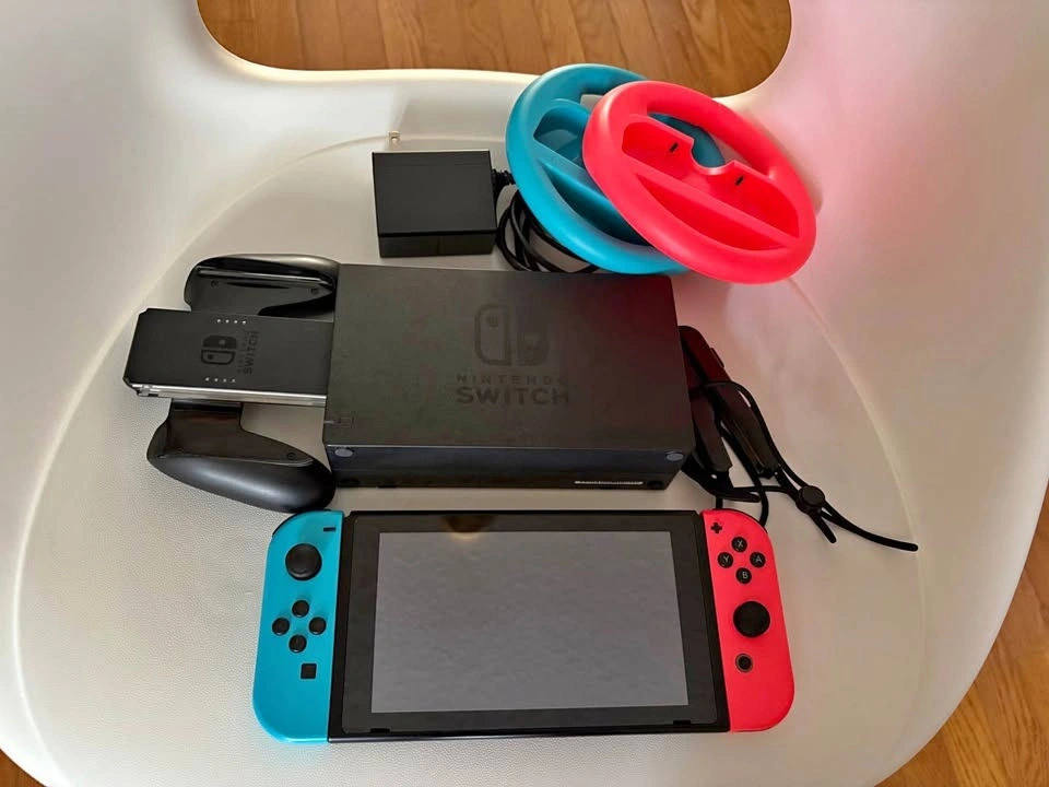Awesome Nintendo Switch console bundle. Includes the console, blue and red Joy-Cons, the dock, power adapter, and Joy-Con grip and straps. Also has two steering wheel accessories (blue and red) for racing games. Comes with one of three games: FIFA 18, NBA 2K19, or NBA 2K18. Everything you need to start playing! Also comes with a free travel bag. Normal wear and minor scratches from use. Cash only, pick up in Markham at 16th Ave and 9th Line.