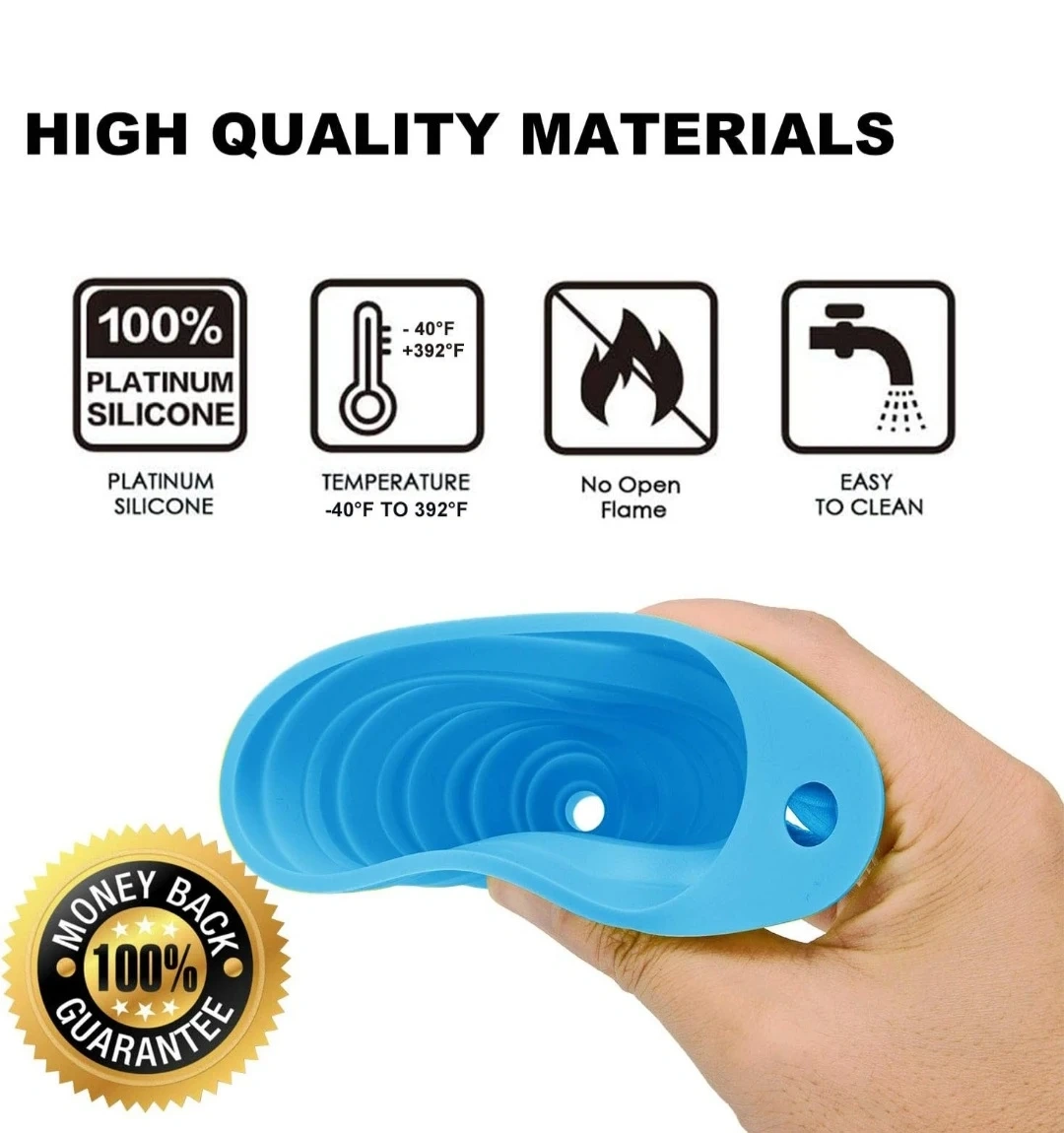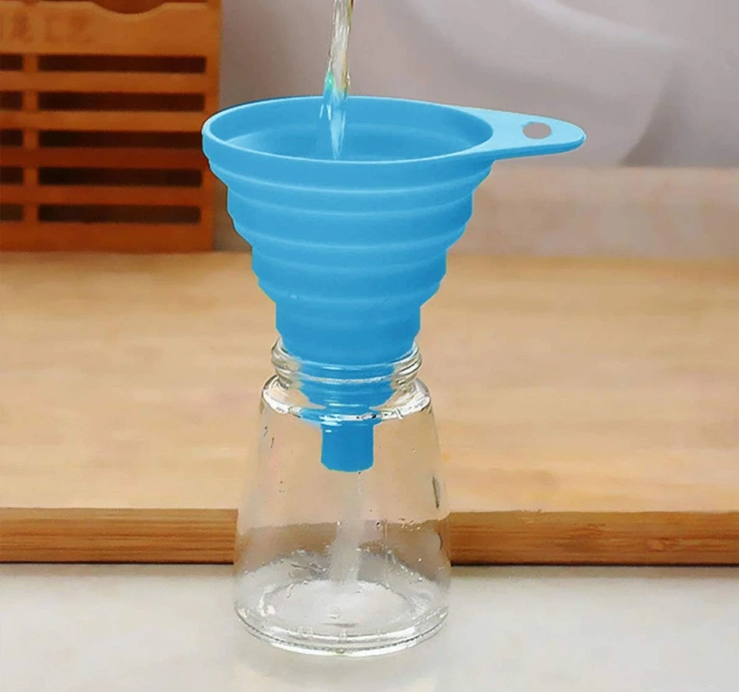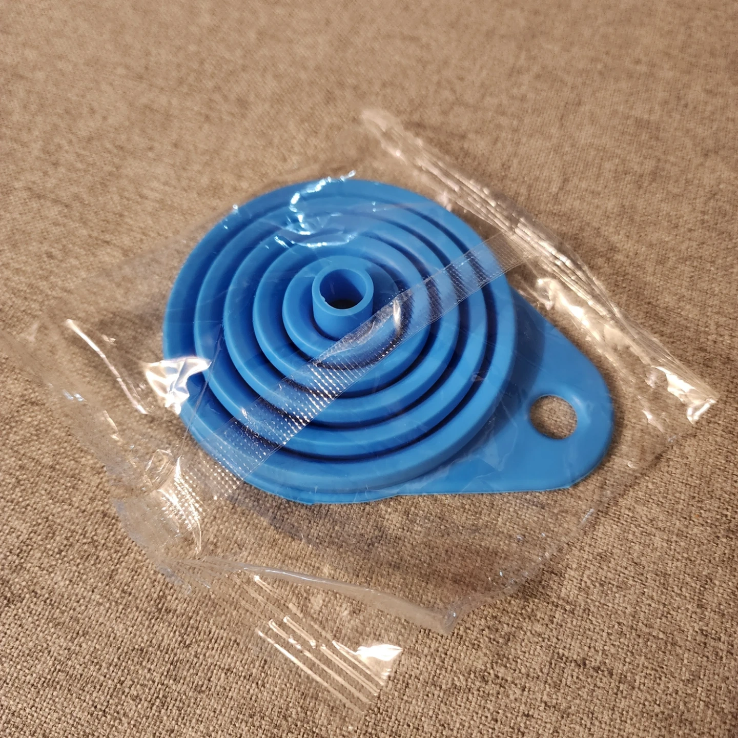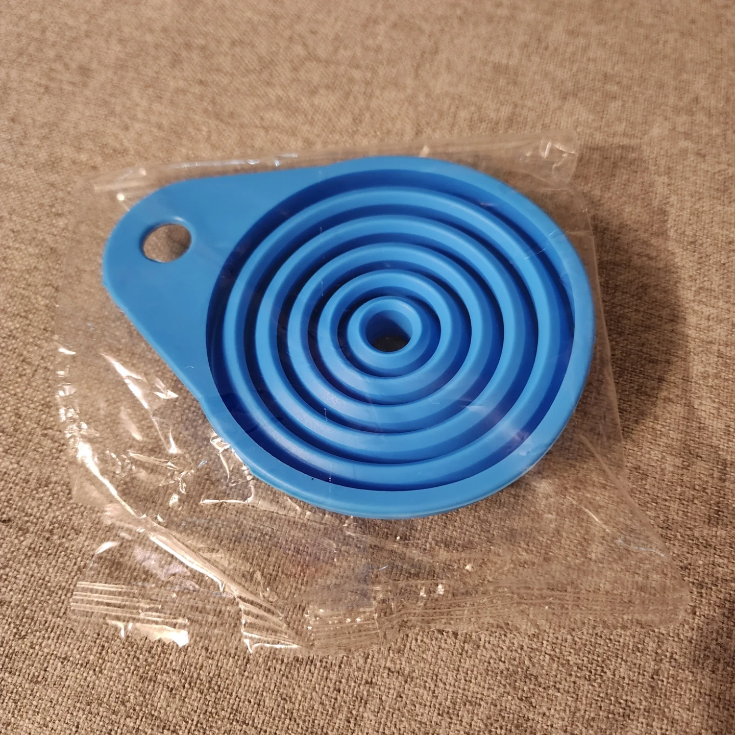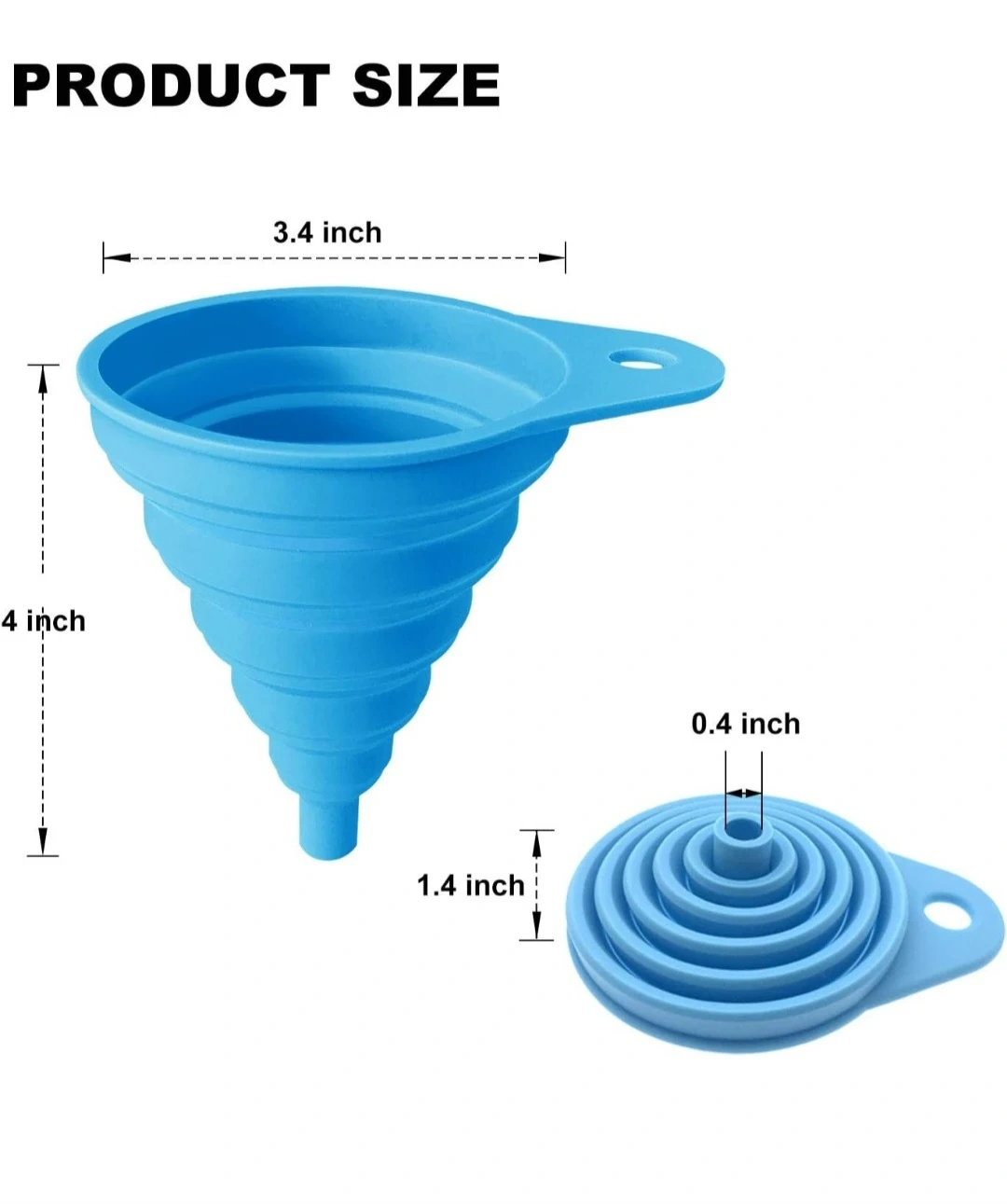 This is a blue collapsible silicone funnel. It's made from 100% platinum silicone and can withstand temperatures from -40°F to 392°F. It's easy to clean and doesn't support open flames. The funnel measures 3.4 inches wide and 4 inches tall when open, collapsing to 1.4 inches tall for storage.