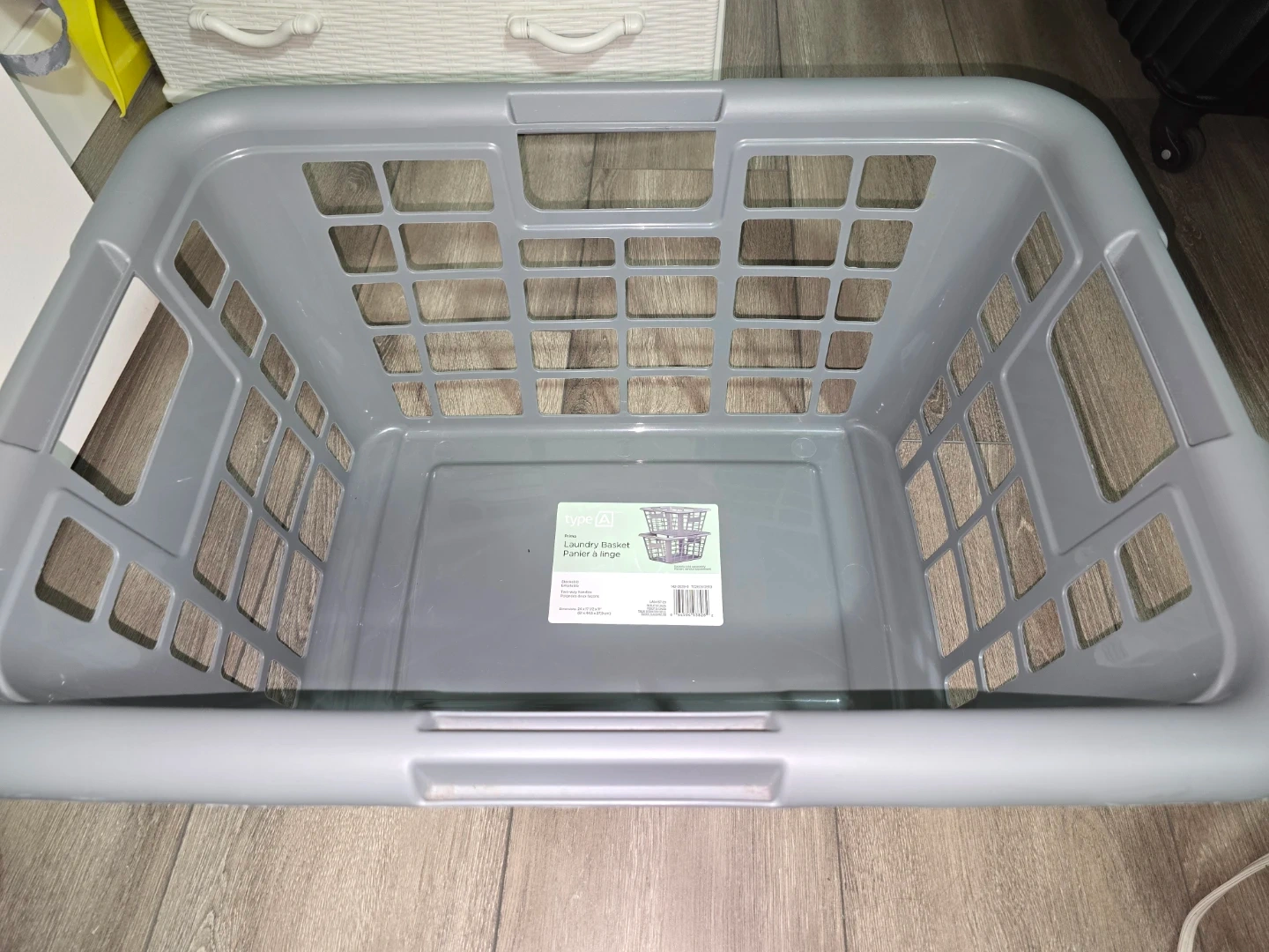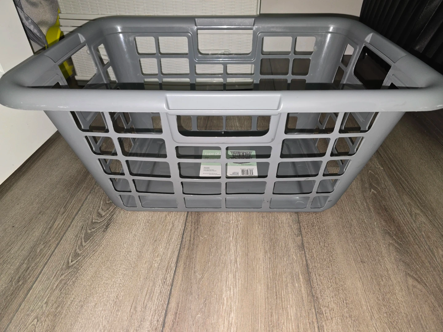 This grey Sterilite laundry basket is made of plastic and has sturdy handles. It's perfect for carrying laundry to and from your machine. It's a standard size for holding clothes.
