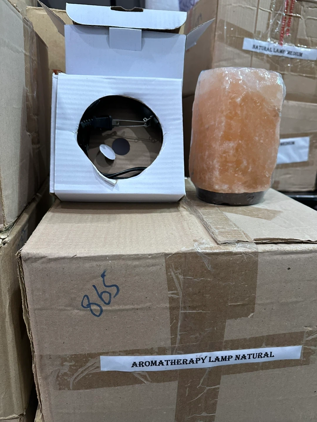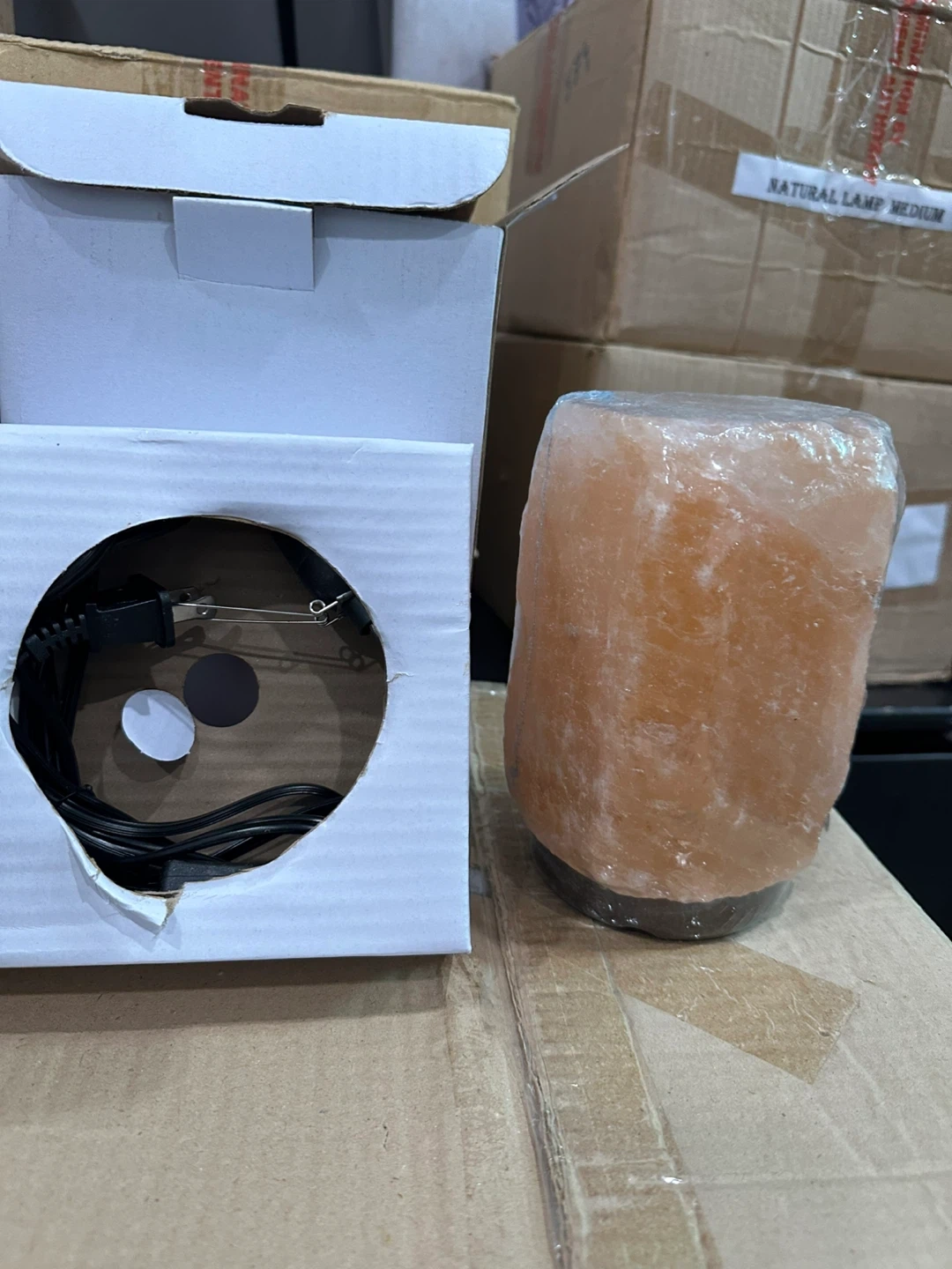 This is a natural aromatherapy lamp. It's made from Himalayan salt and includes a cord and bulb. The lamp is medium size.