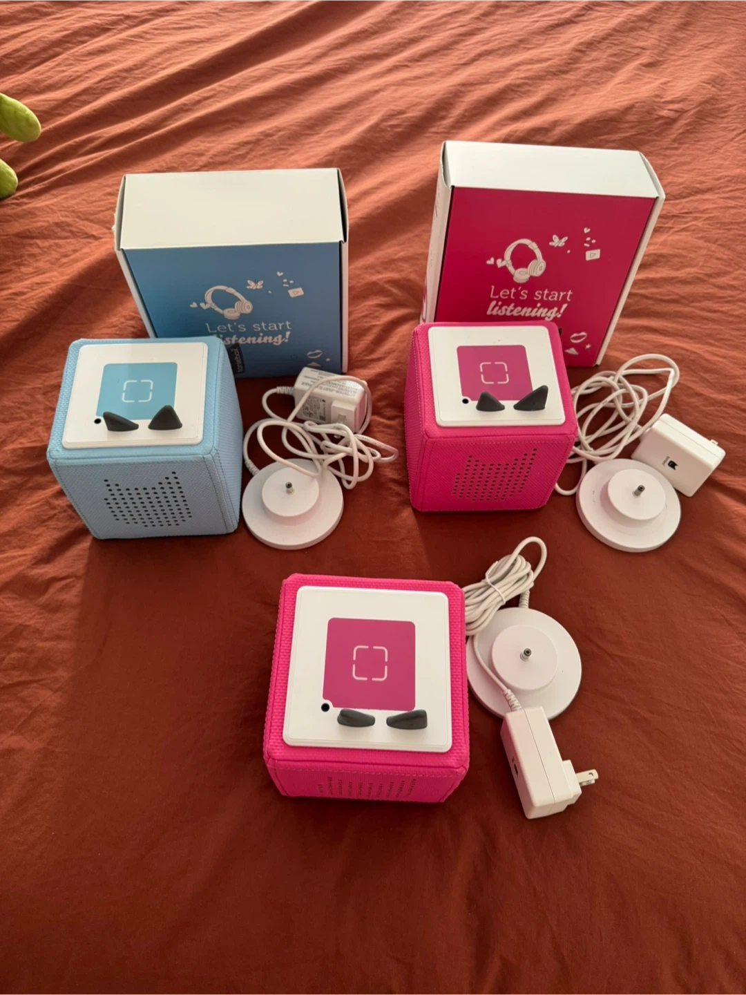 I ah e available 3 Toni boxes, 2 with its respective headphones a done without. Two are pink and one blue, along with their respective charging bases and power adapters. I am selling each box at 50, and if buying all together we can work on a deal.