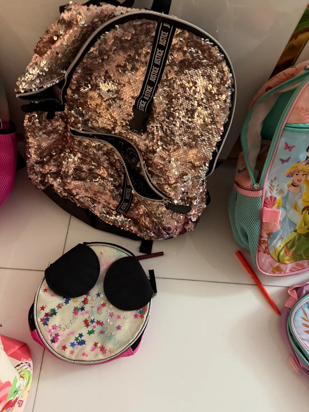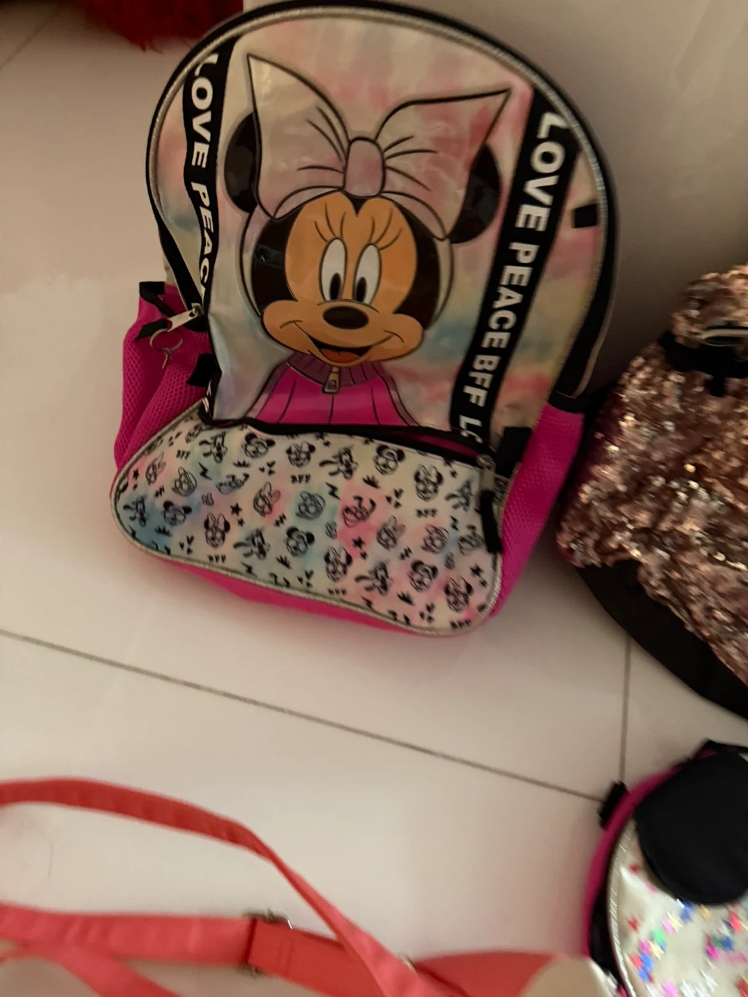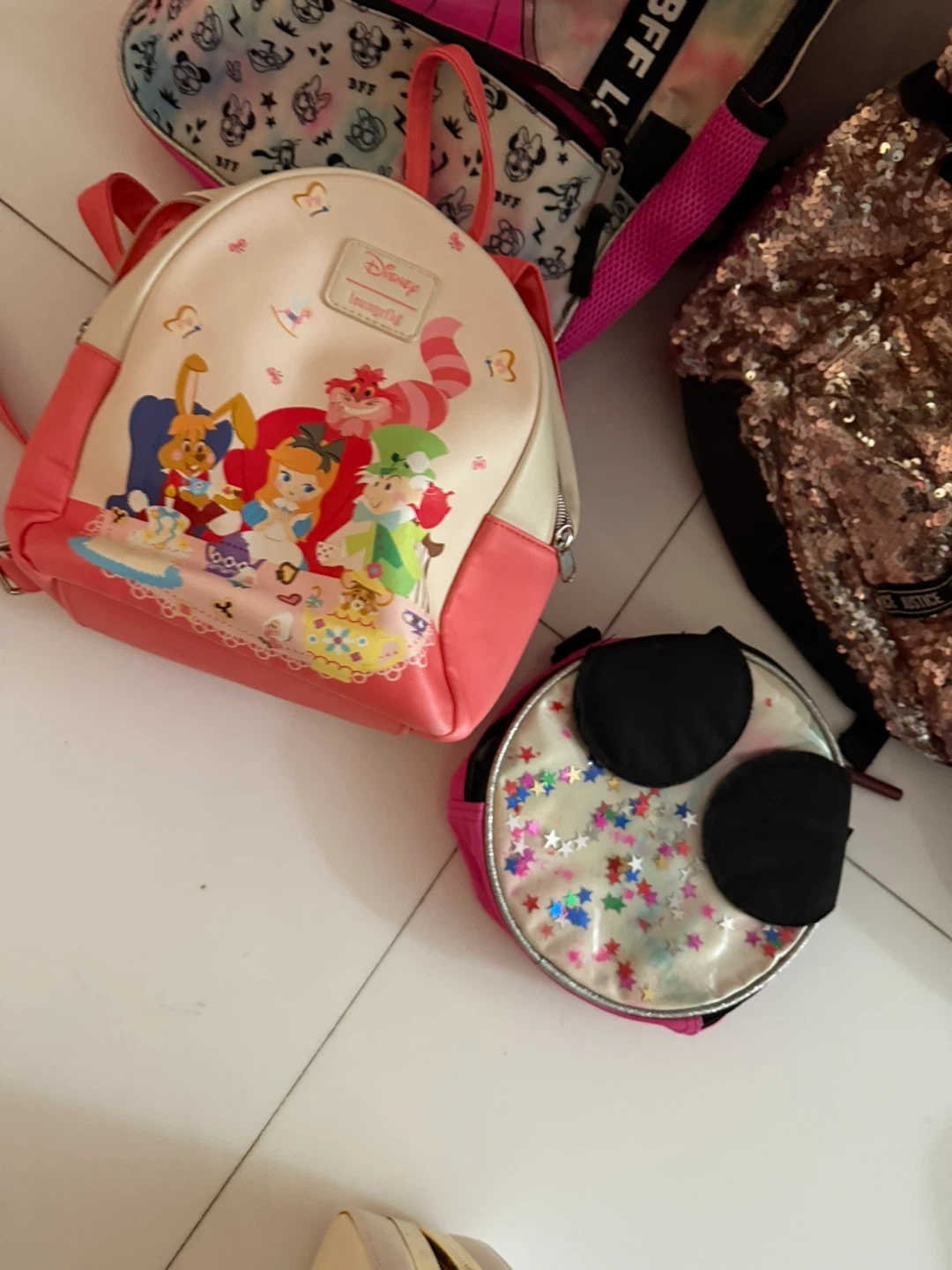 Selling a lot of Disney themed backpacks and bags. They feature popular characters like Minnie Mouse, Alice in Wonderland, and Ariel. Perfect for young Disney fans!