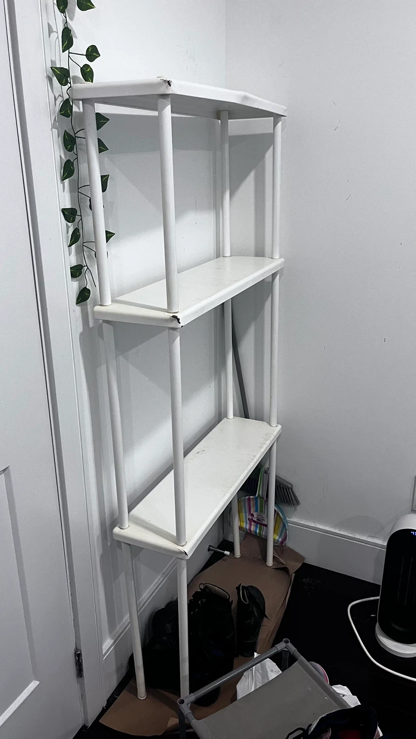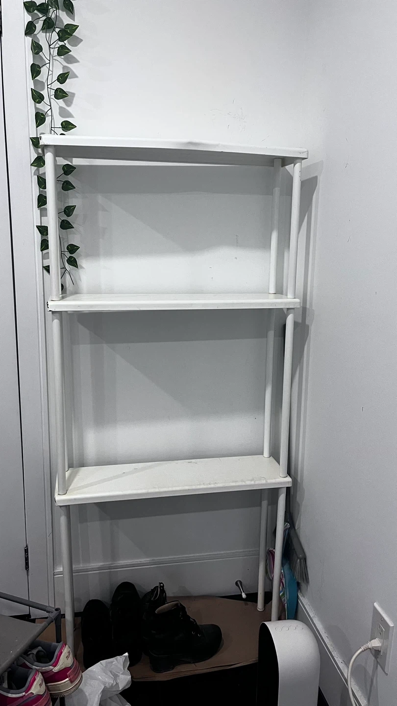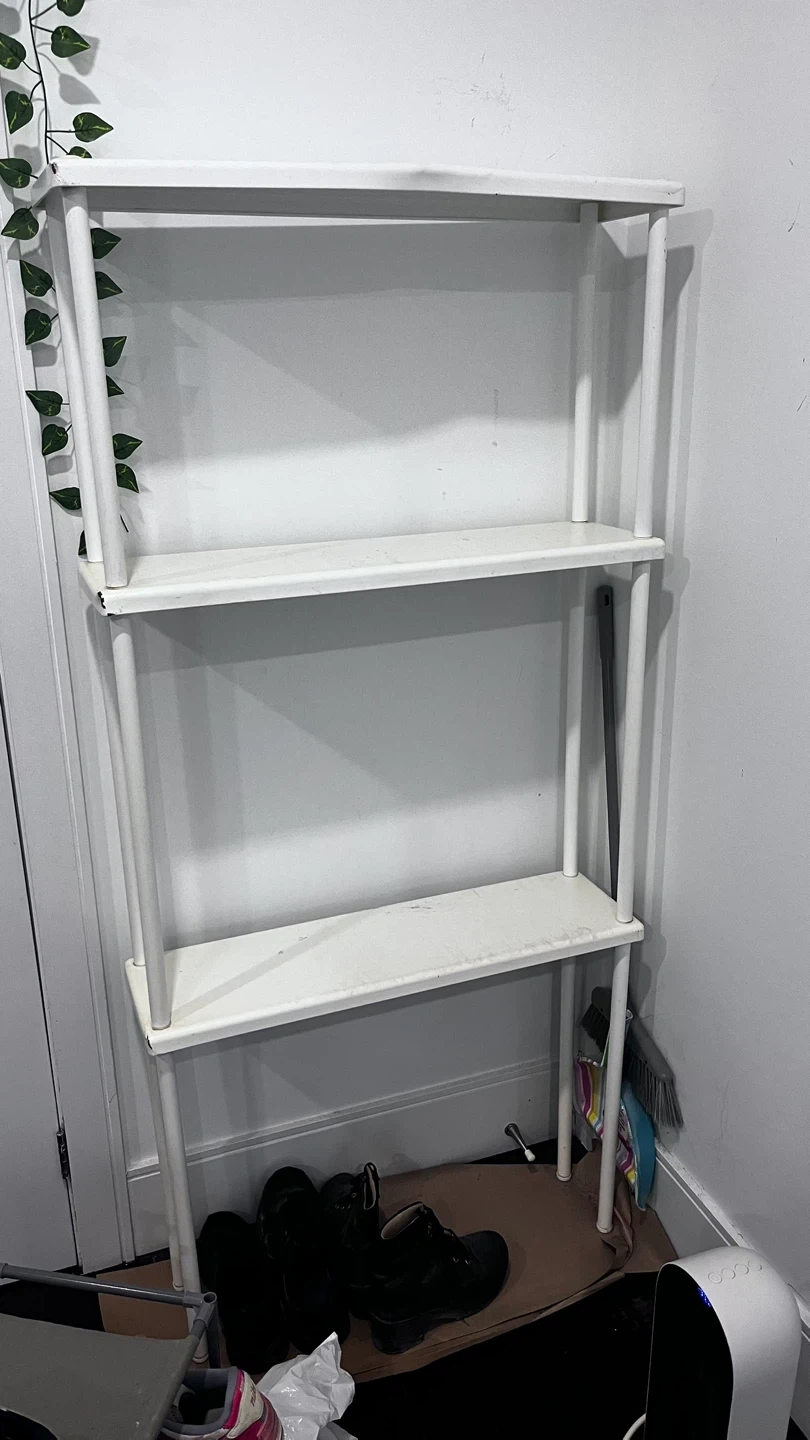 This is a simple white 3-shelf bookshelf. It's made of sturdy materials and offers plenty of storage. The shelves are spaced out nicely for books or decor. This is a vintage shelf.