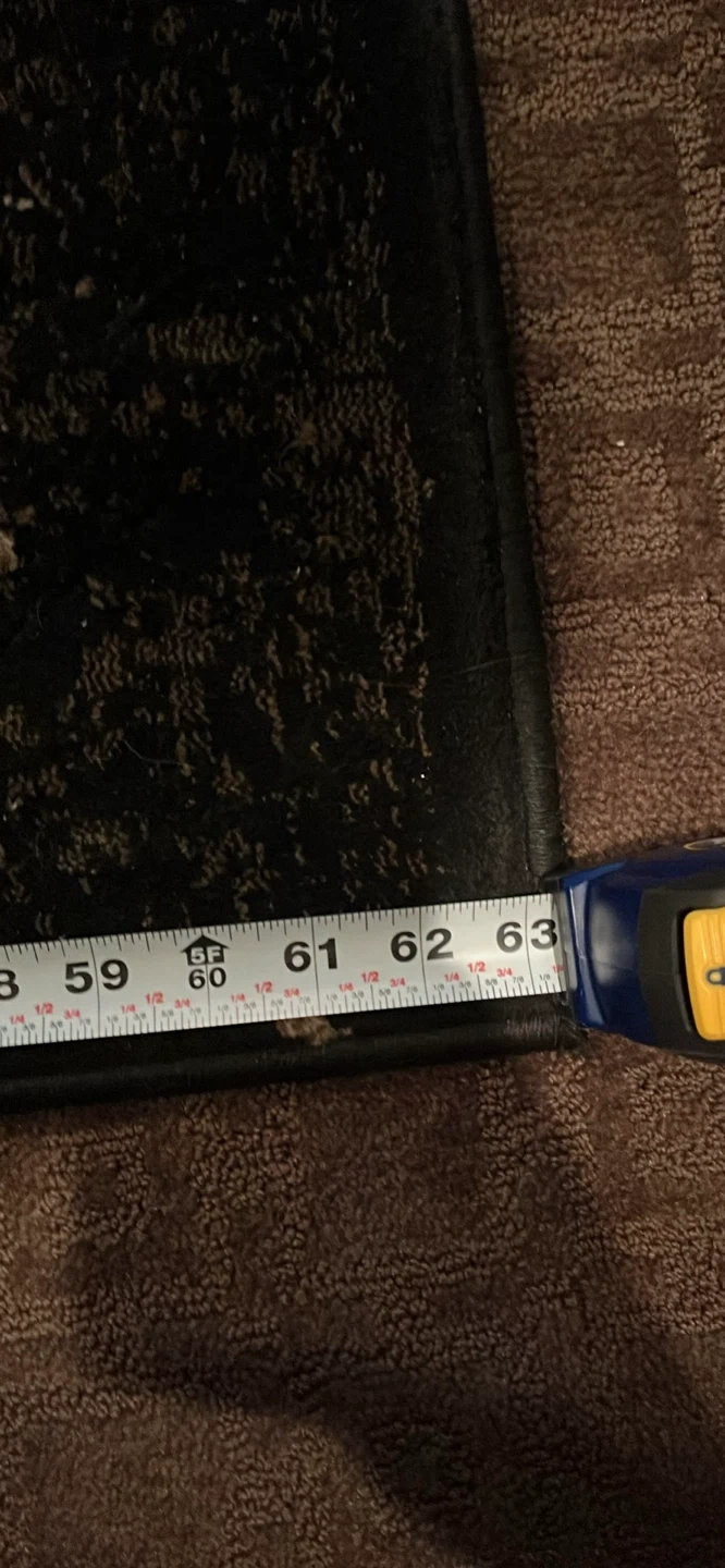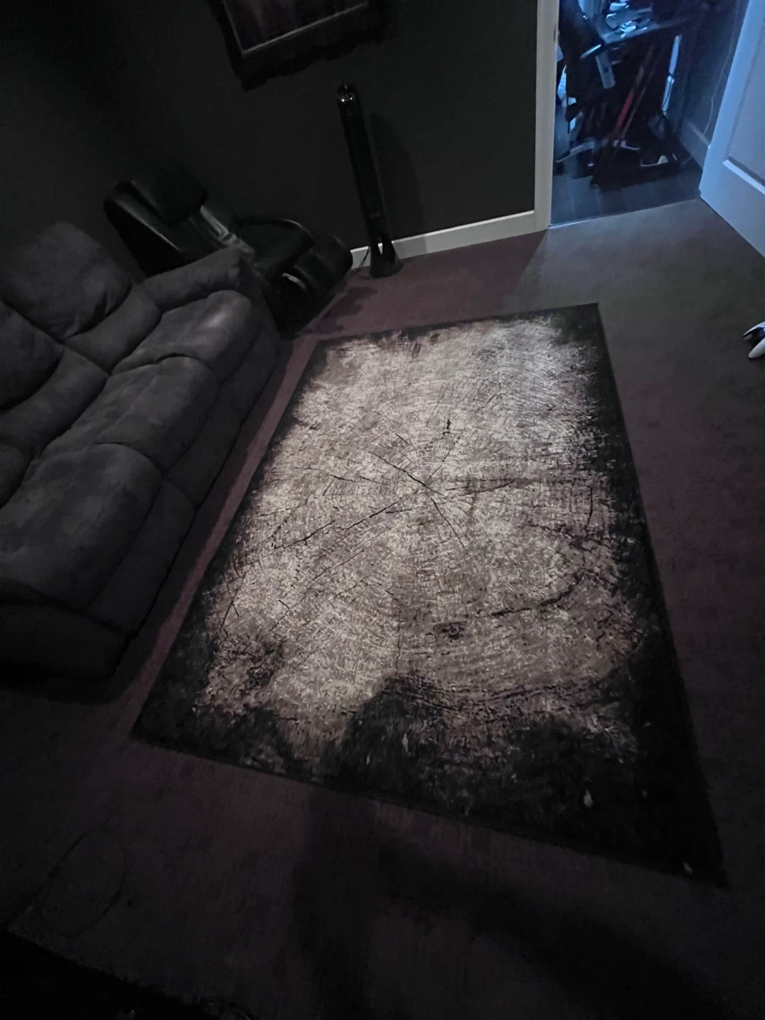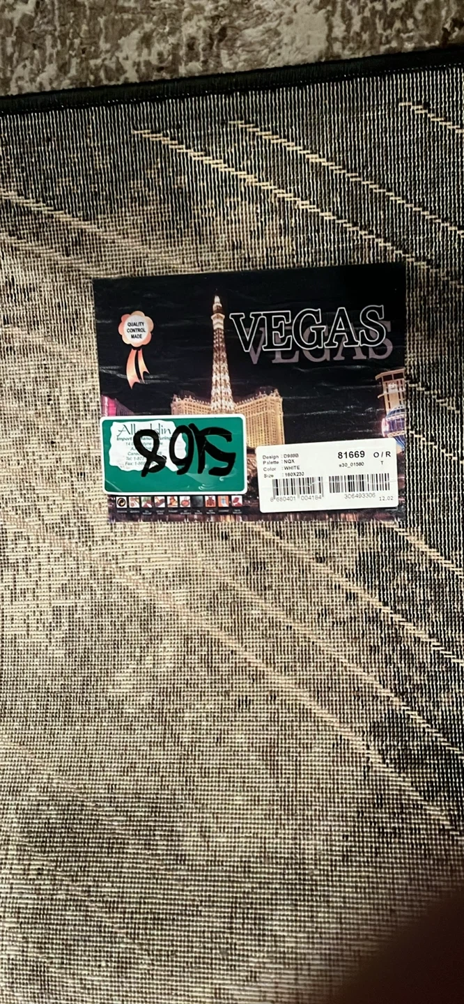 This is a Vegas brand rug with a tree ring design. It's approximately 5.25 feet by 6.25 feet. The colour is white and black.