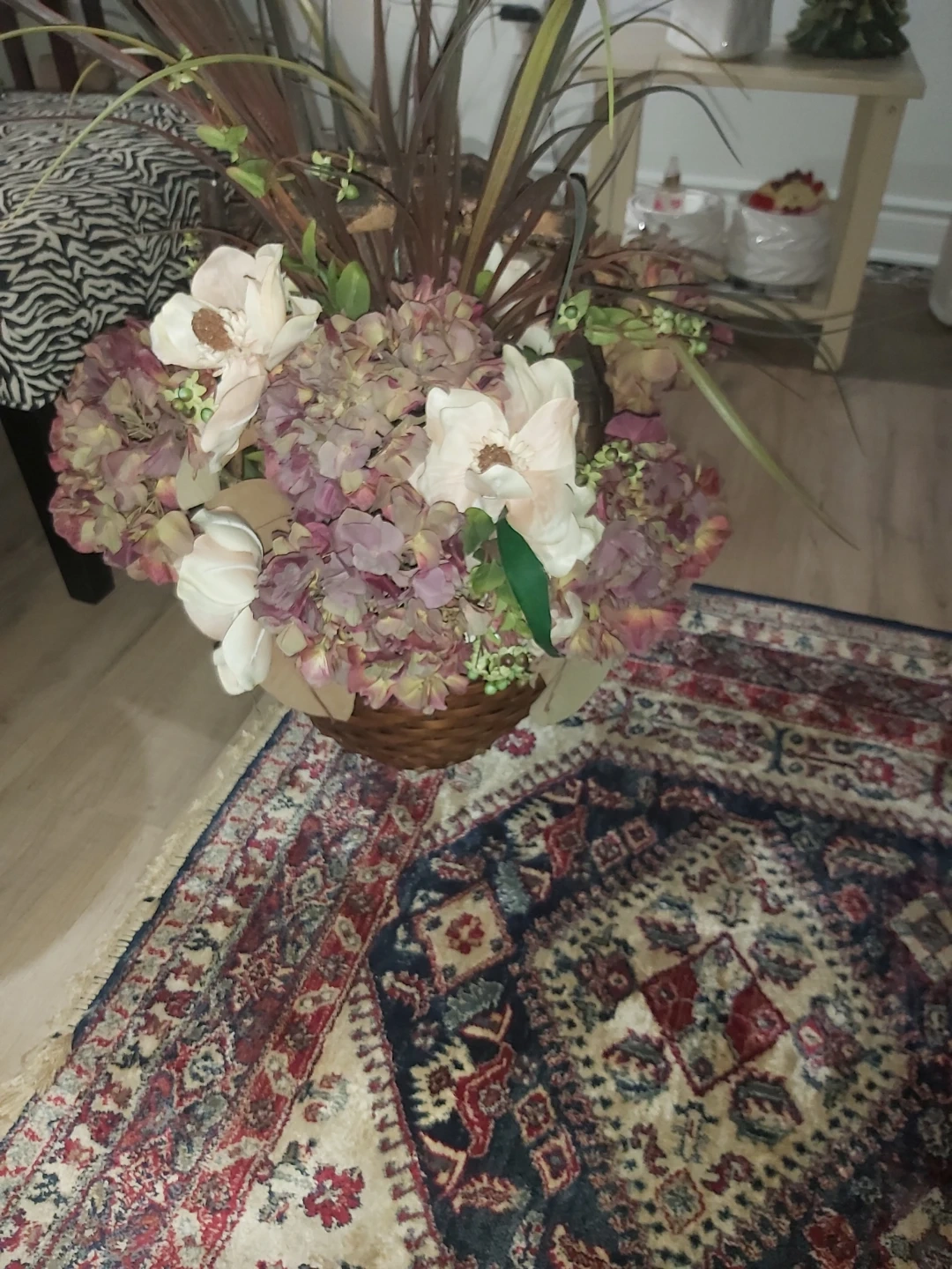 Lovely artificial floral arrangement featuring hydrangeas and lilies in a natural wicker basket. It's a beautiful decorative piece for any room.