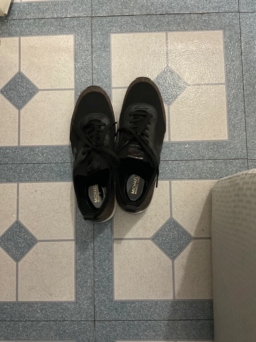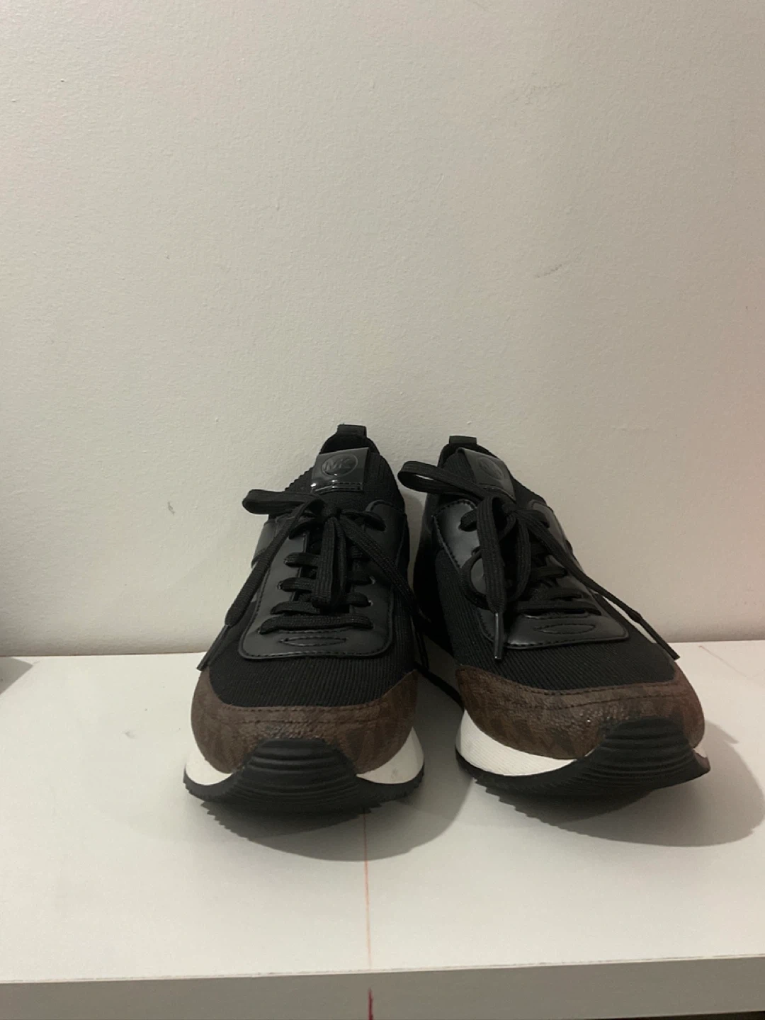 Michael Kors black knit and leather low-top sneakers with brown signature print accents. Comes with box. pickup only