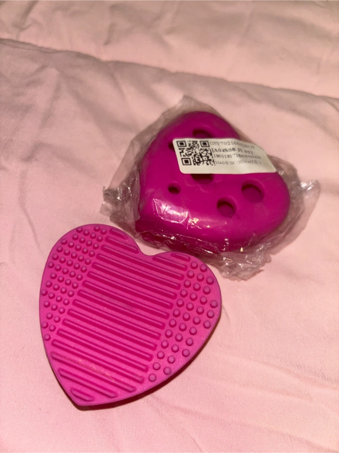 This kit includes a heart-shaped silicone brush cleaner and a round tin with a sponge for drying brushes. It's designed to help you clean your makeup brushes effectively. The tin helps keep things tidy after cleaning.