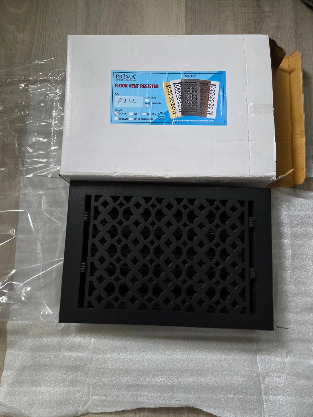This is a Prima brand floor vent register. It's a black, 8x12 inch size. This register is designed for floor installation. It's cast aluminum brand new i had wrong measurements just looking to get back some of what I spent