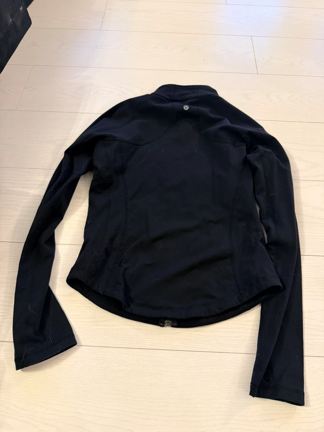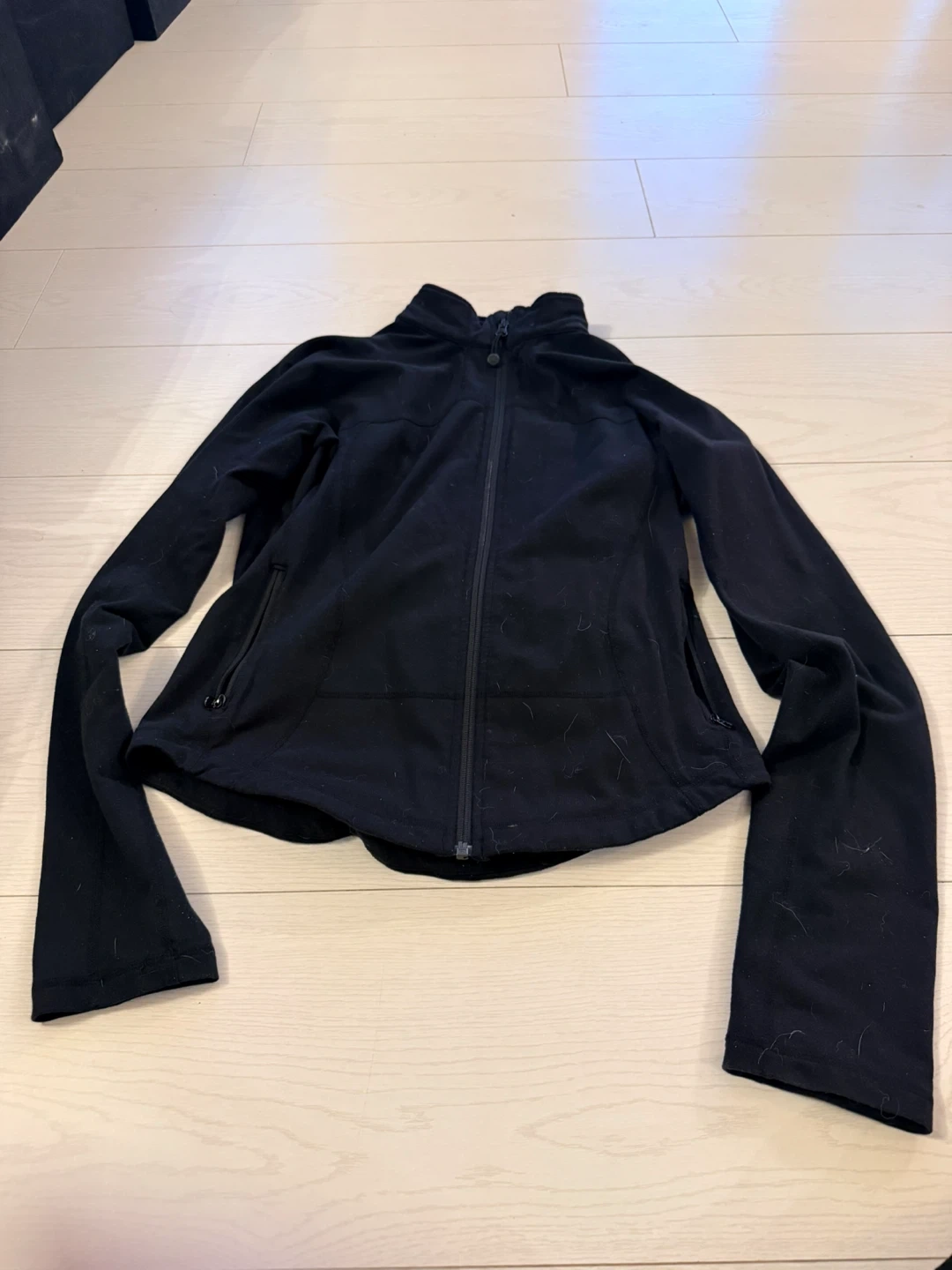 Lululemon athletic jacket in black. It's a full zip with zippered pockets. Fabric is stretchy and breathable.