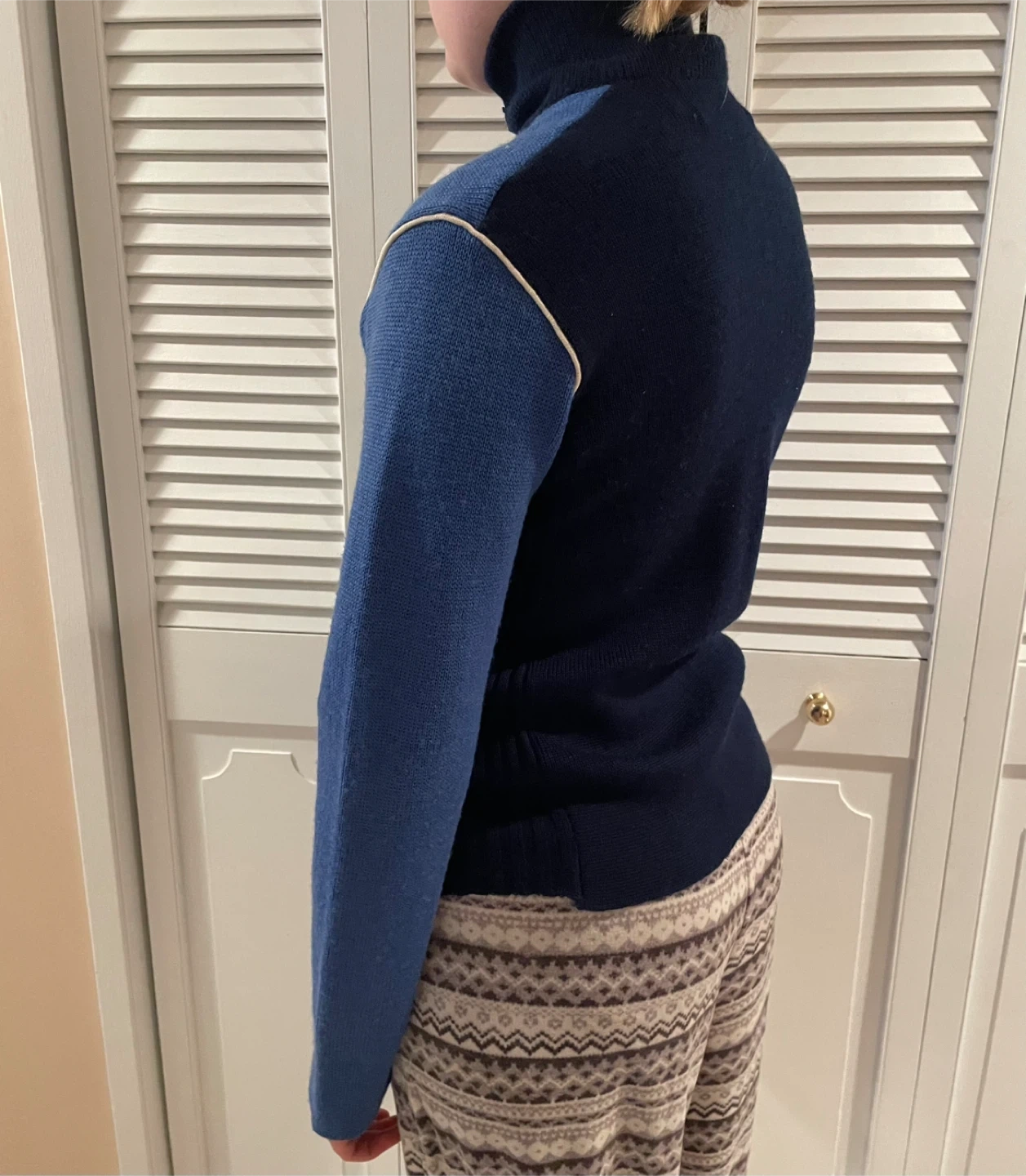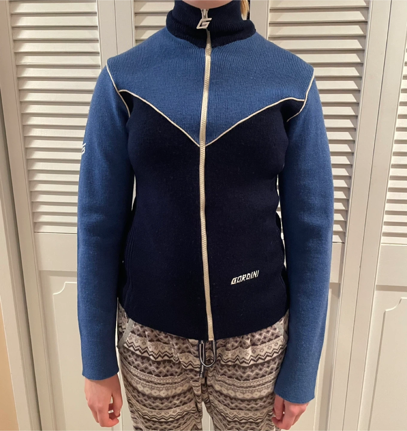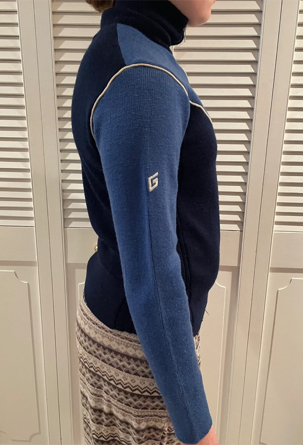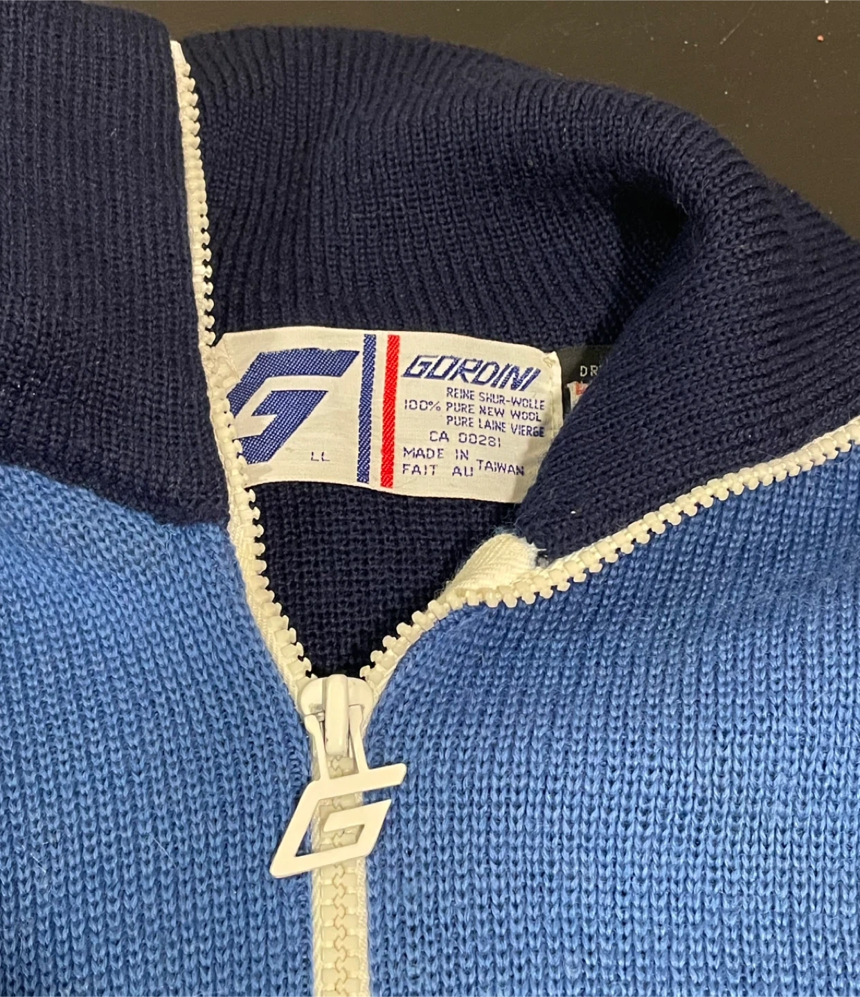 Vintage Wool Ladies sporty GORDINI zip-up sweater with a turtleneck collar. It's dark navy and royal blue with contrasting cream piping. Material is 100% wool. Great vintage shape!