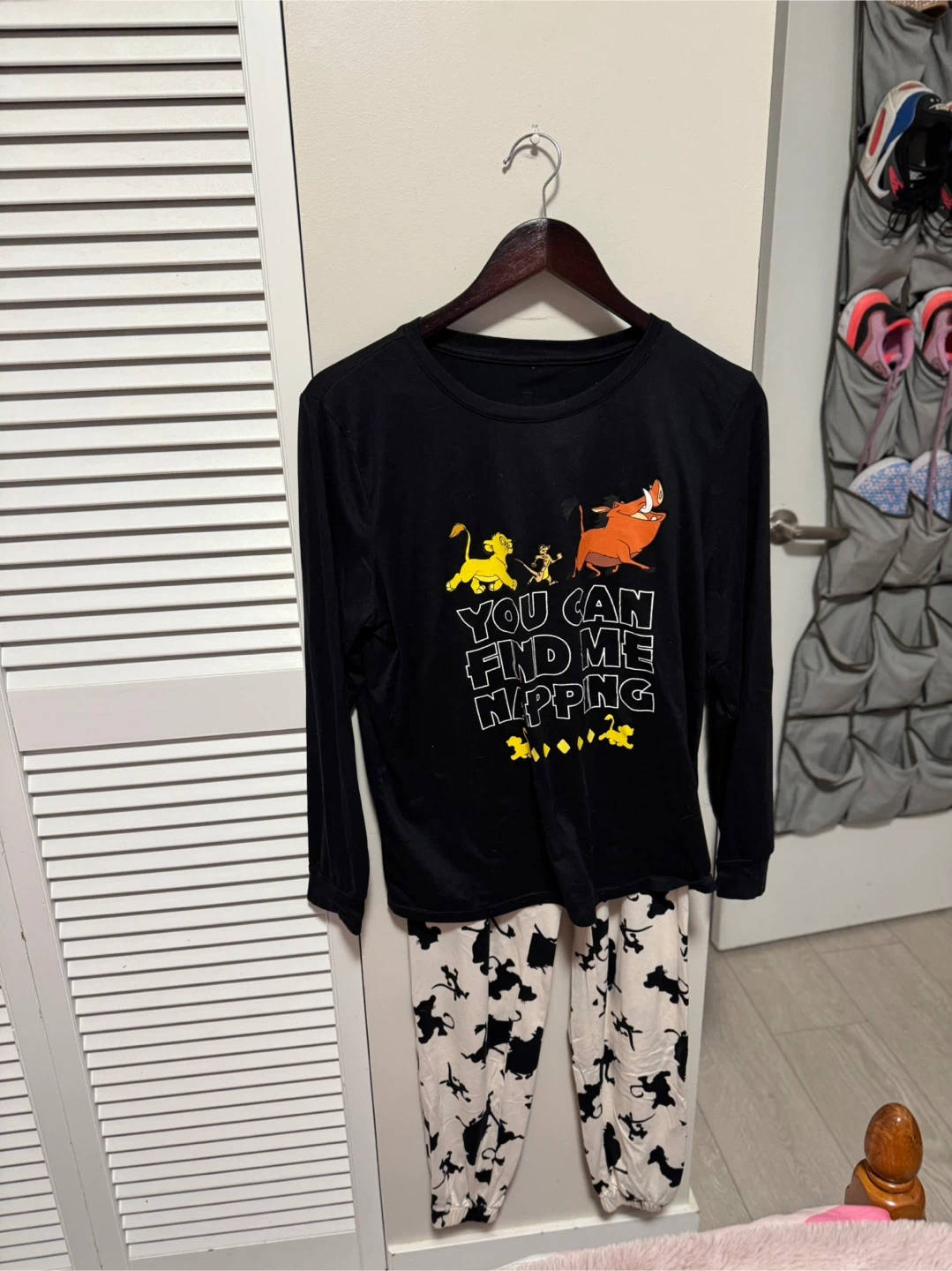 Black long-sleeve top with a "You Can Find Me Napping" graphic featuring characters from Disney's The Lion King. Comes with matching white pajama pants patterned with the same characters. Great for relaxing or sleeping!