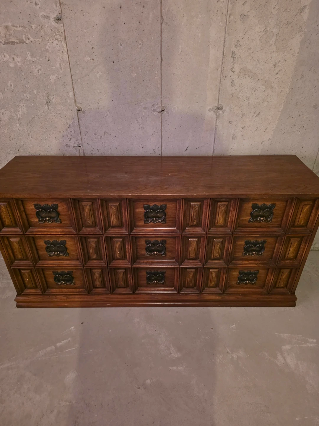 This is a vintage solid wooden dresser featuring a dark wood finish and ornate drawer pulls. It has twelve drawers providing ample storage space. Its classic design would complement various bedroom decors.