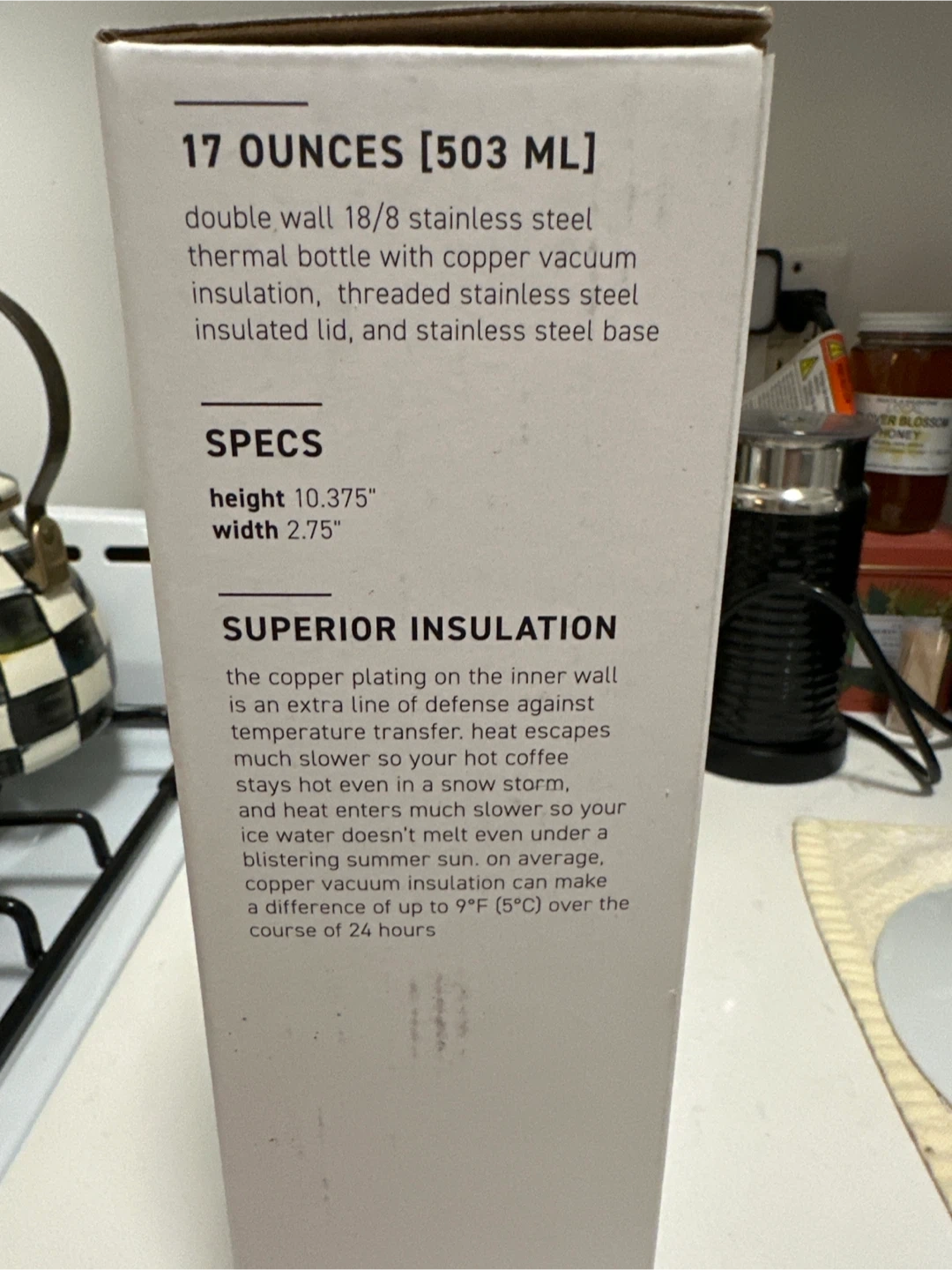 Stay hydrated with this 17 oz Amaë Health stainless steel water bottle. It's white with a silver cap and base. Perfect for carrying your favorite beverages on the go!