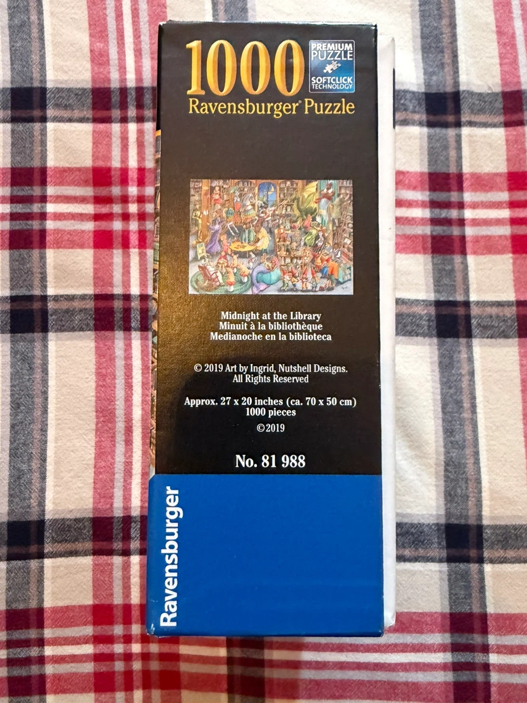 This is a 1000-piece Ravensburger puzzle titled "Midnight at the Library". It's made with softclick technology for a perfect interlocking fit. Dimensions are approx. 27 x 20 inches (70 x 50 cm). includes all pieces.