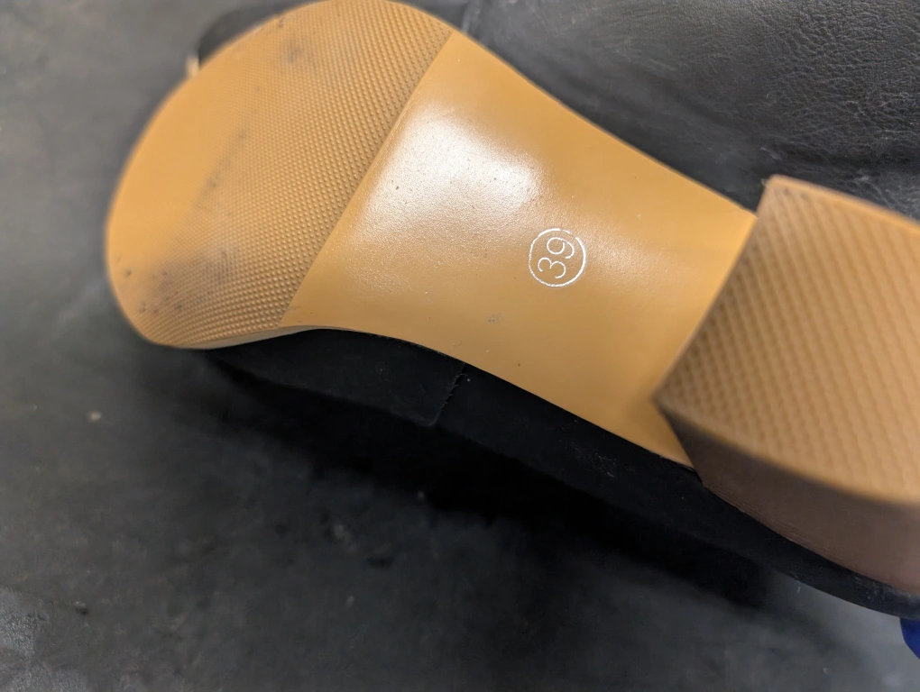 These stylish black ankle boots feature a comfortable block heel and a unique V-shaped opening. The sole is marked with size 39. They're made from a faux leather material.