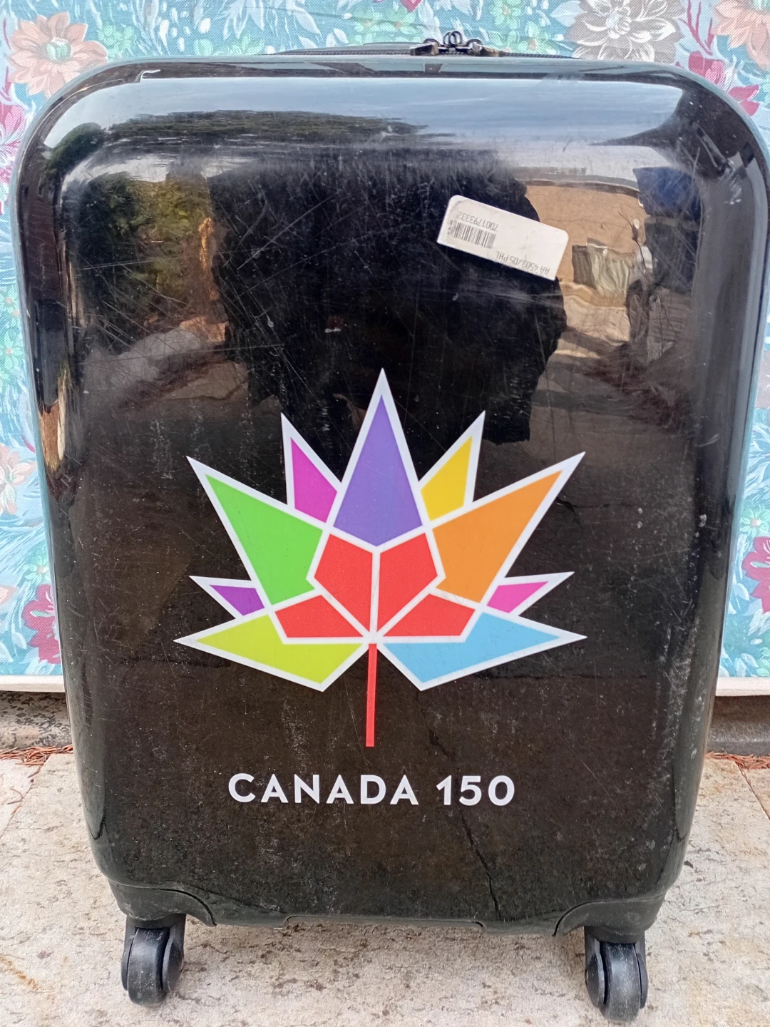 Black rolling suitcase with a colourful maple leaf design and "CANADA 150" text. It's a great piece for travel enthusiasts celebrating Canada's 150th anniversary. Four spinner wheels for easy manoeuvring.