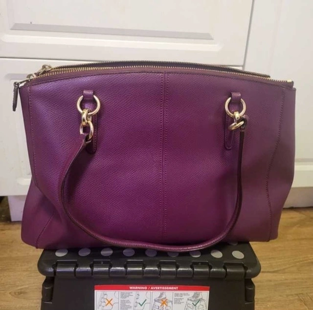 This is a used Coach satchel in a beautiful plum colour. It's in good condition, with some signs of wear. It features a zip-top closure, gold-tone hardware, and a detachable shoulder strap.