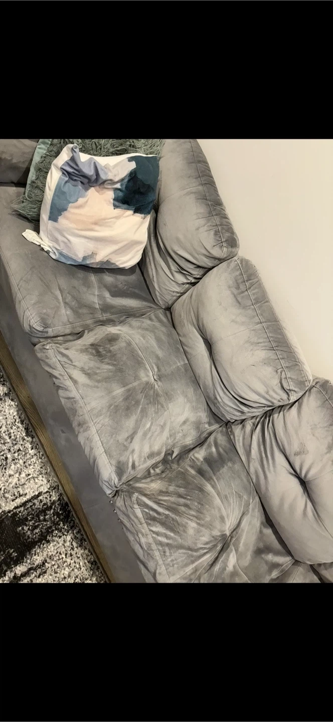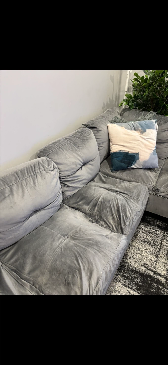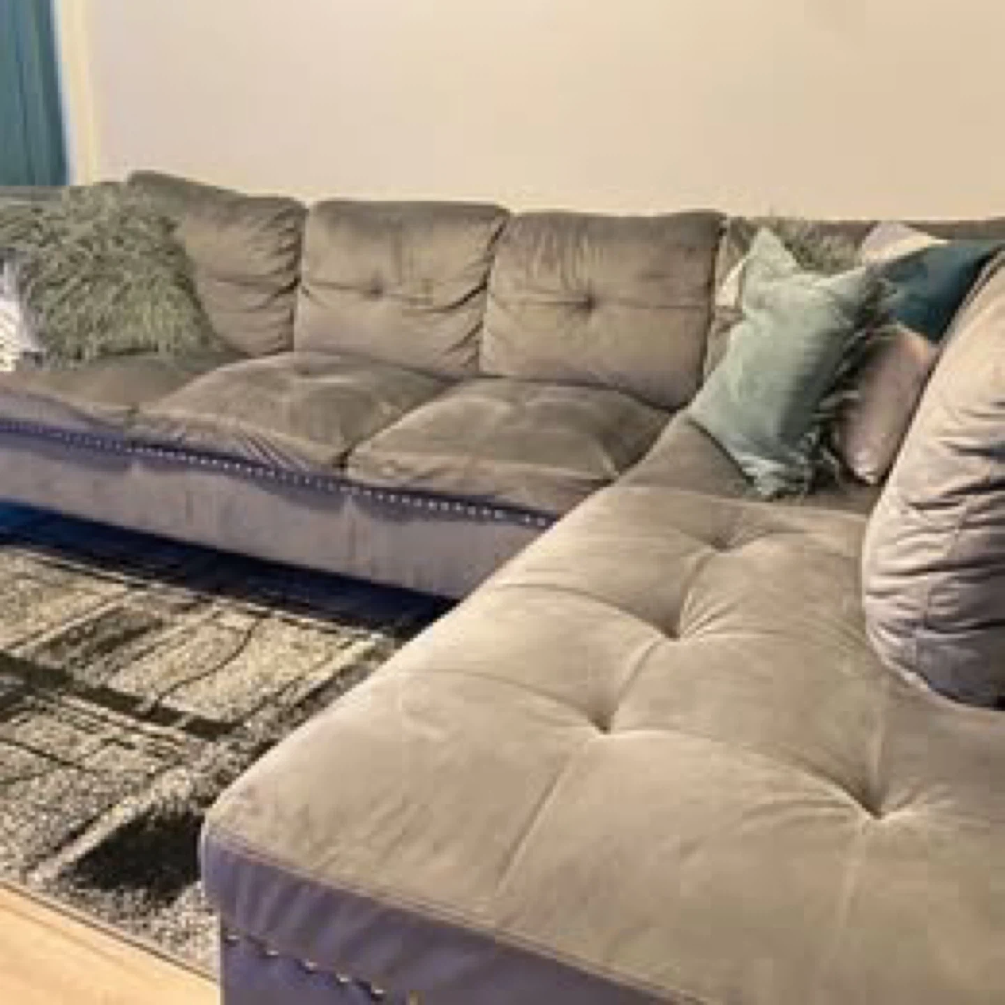 Comfortable tufted grey sectional sofa. Upholstered in soft velvet-like fabric. Features stylish nailhead trim detailing along the base. Offers ample seating space for gatherings.