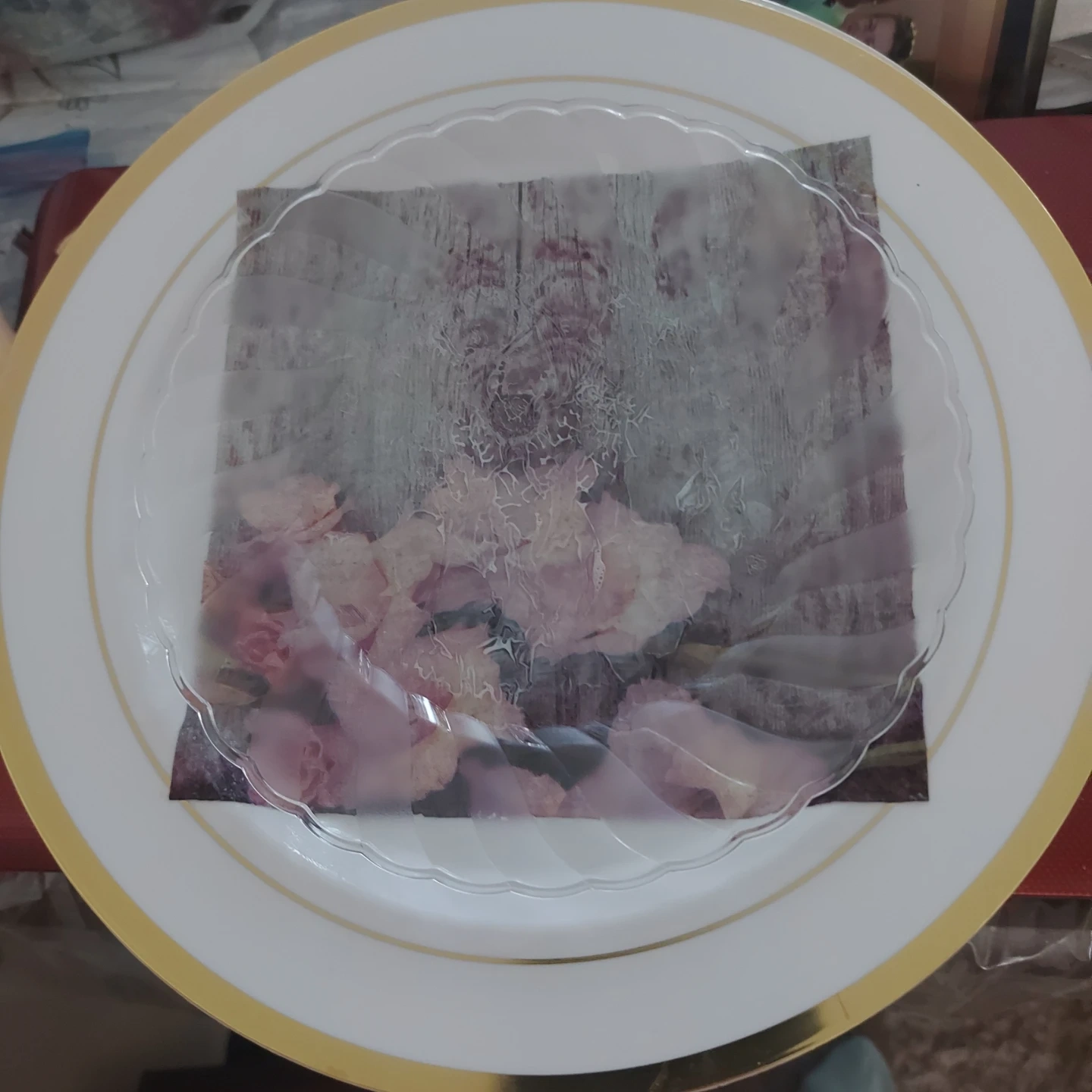 White plate with a gold rim, featuring a clear plastic overlay with a rustic wood and floral print. It's suitable for decorative display or as a unique serving piece.