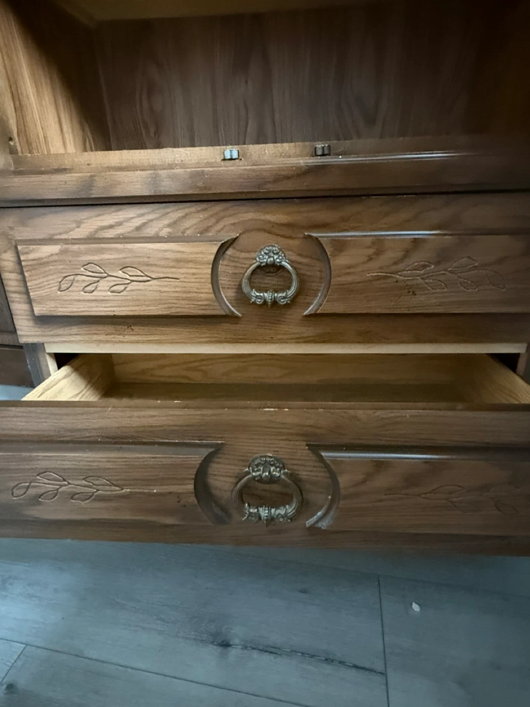Leaf carvings on the wood on both. Bought at Sears as noted in pic.