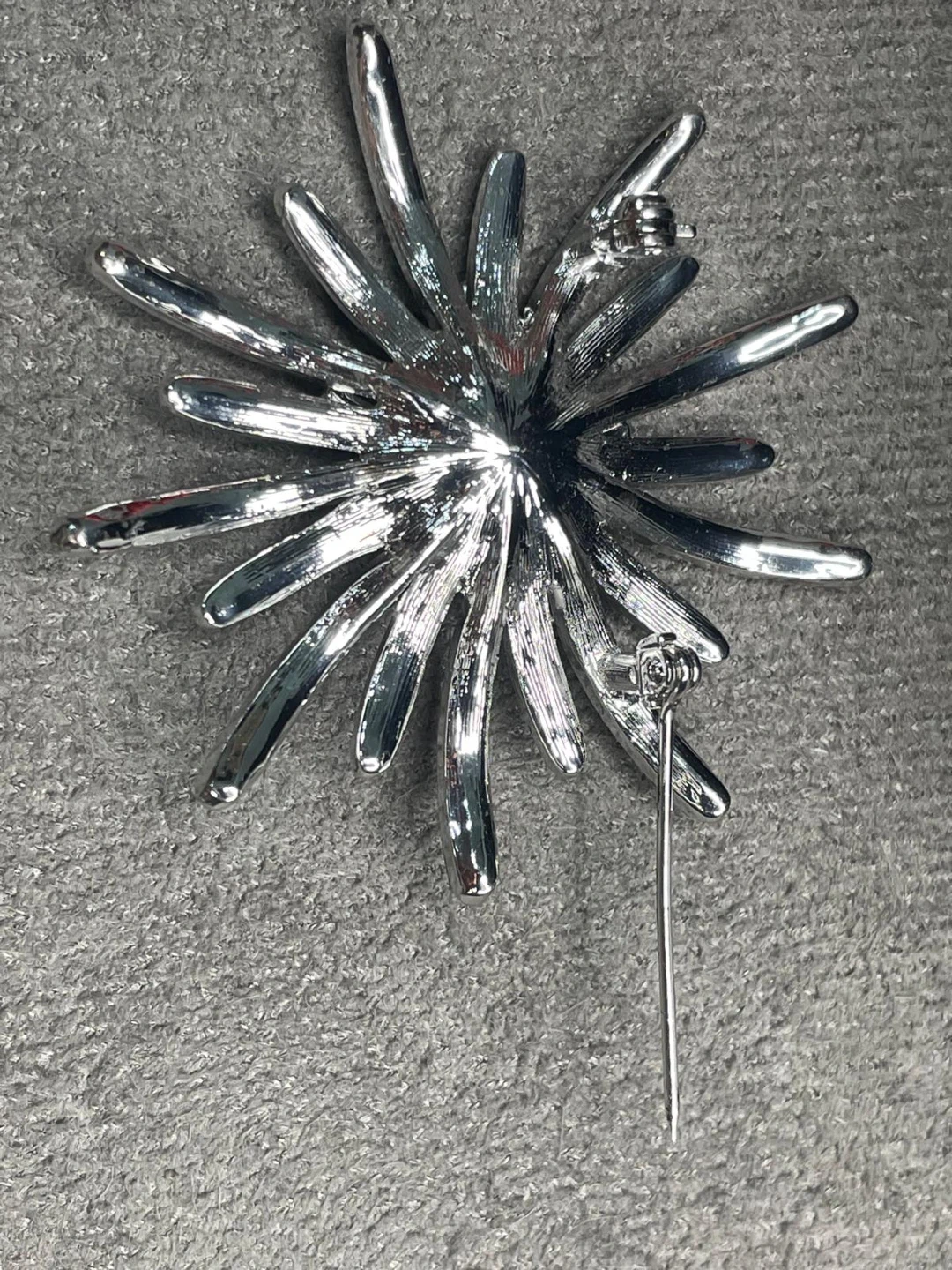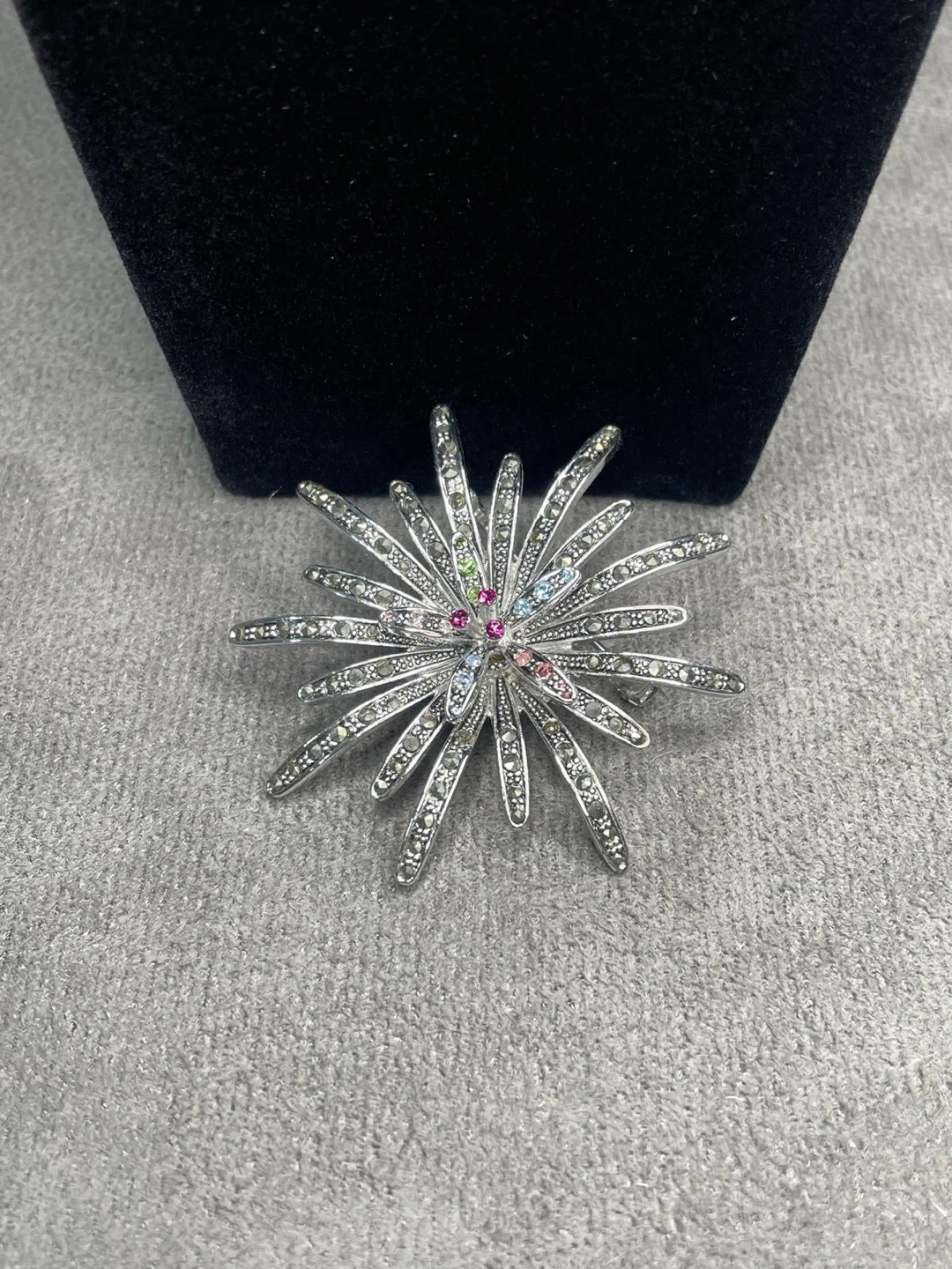 Sparkling silver-toned starburst brooch! It's adorned with small clear, blue, pink, and green gemstones. A lovely statement piece for any outfit.