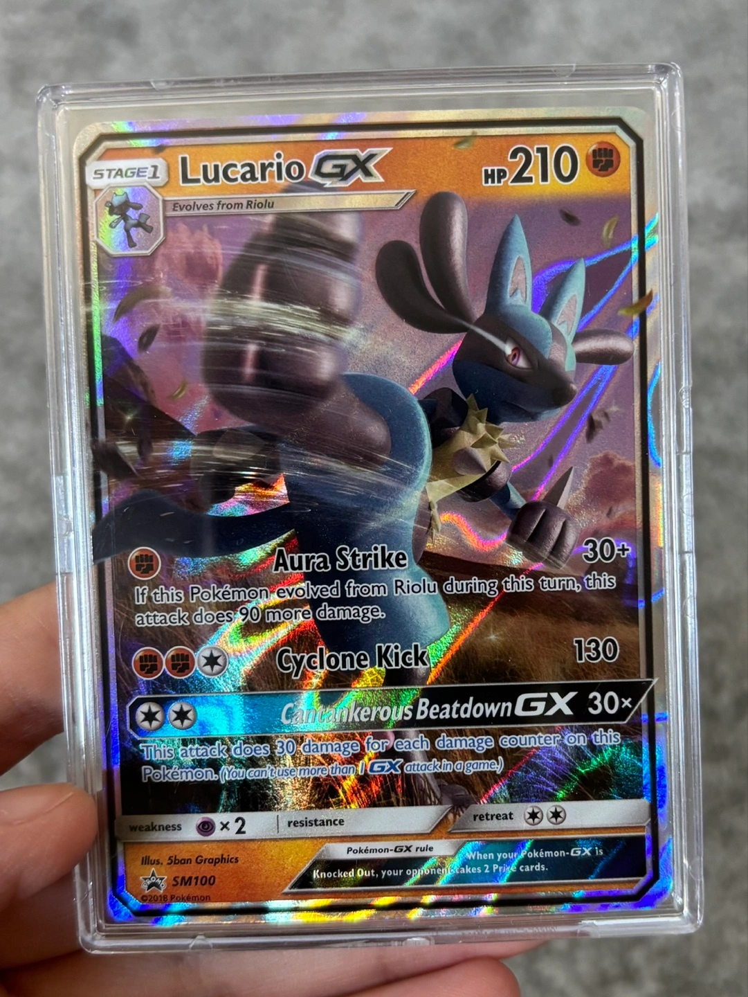 Pokemon card in a protective case. Lucario GX, stage 1. Evolves from Riolu. Features Aura Strike and Cyclone Kick attacks. Comes with a hard plastic case for protection. Great addition to any collection.