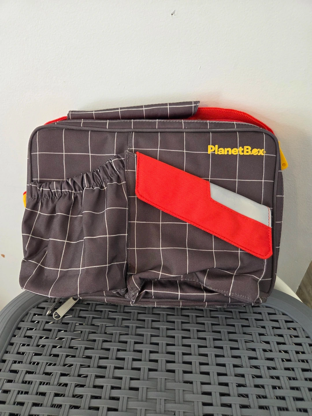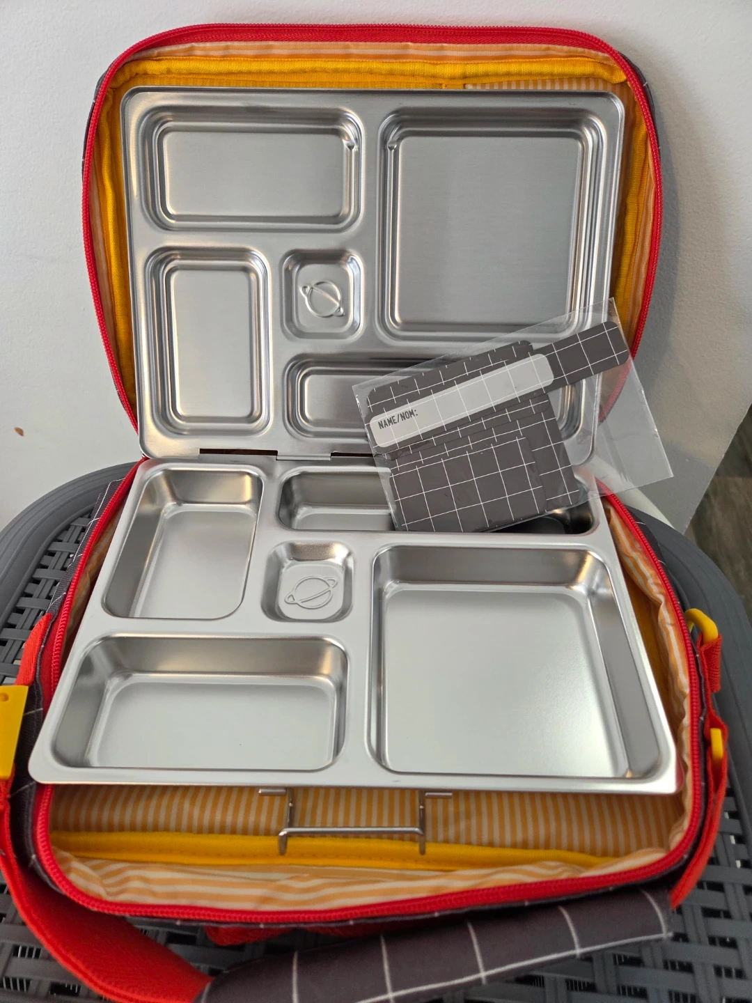 Stainless steel lunch box with multiple compartments. Includes a red and grey patterned bag with side pockets. Perfect for packing a variety of foods for school or outings! $20
