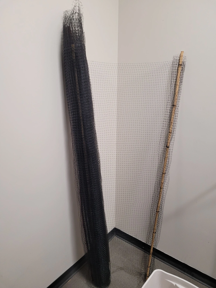 big roll of plastic black netting. for around a booth when it is not open. good used one attached to a bamboo pole. Great for various uses.