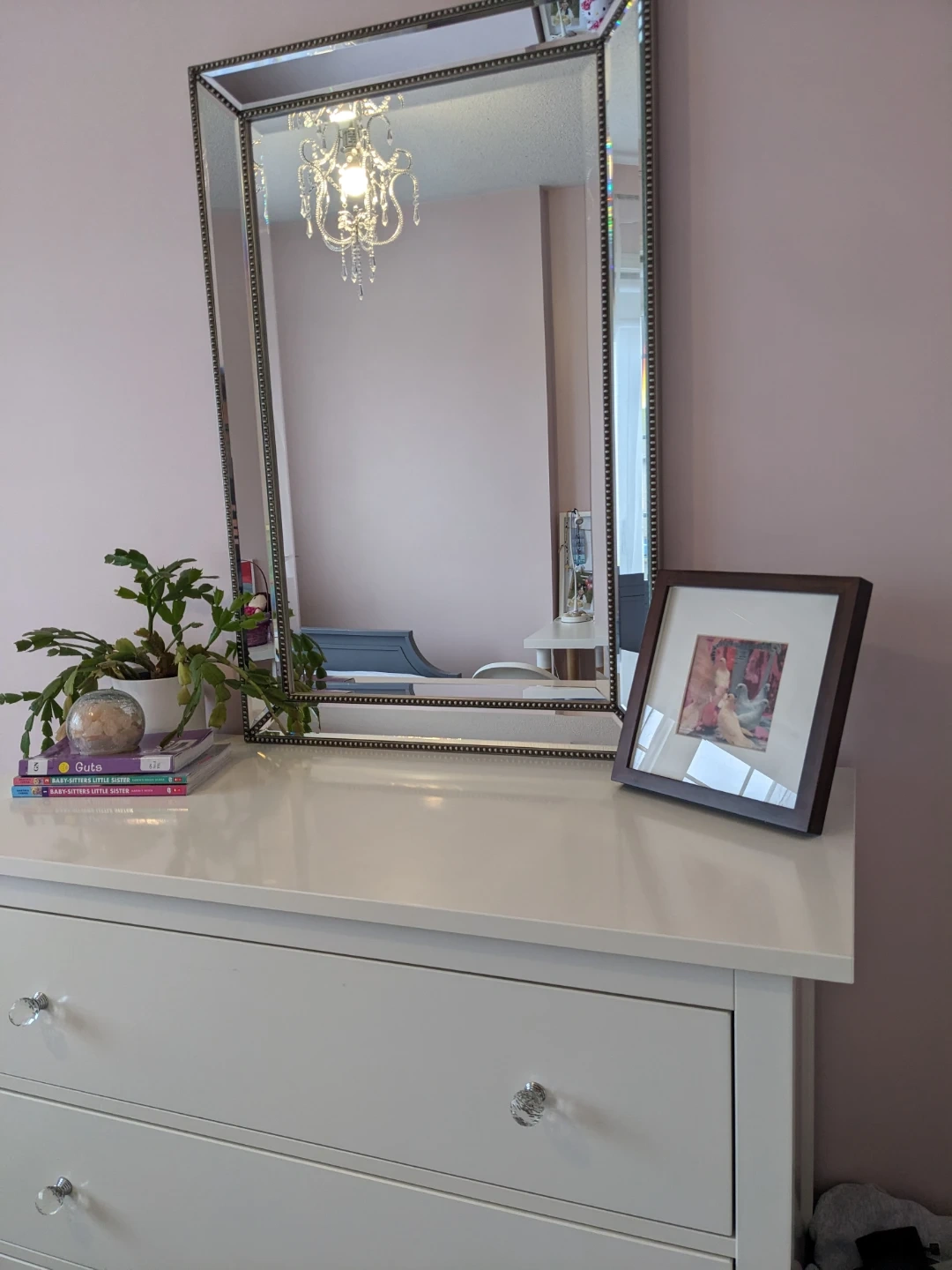 Stunning mirror and White 3-Drawer Dresser with Crystal Knobs
