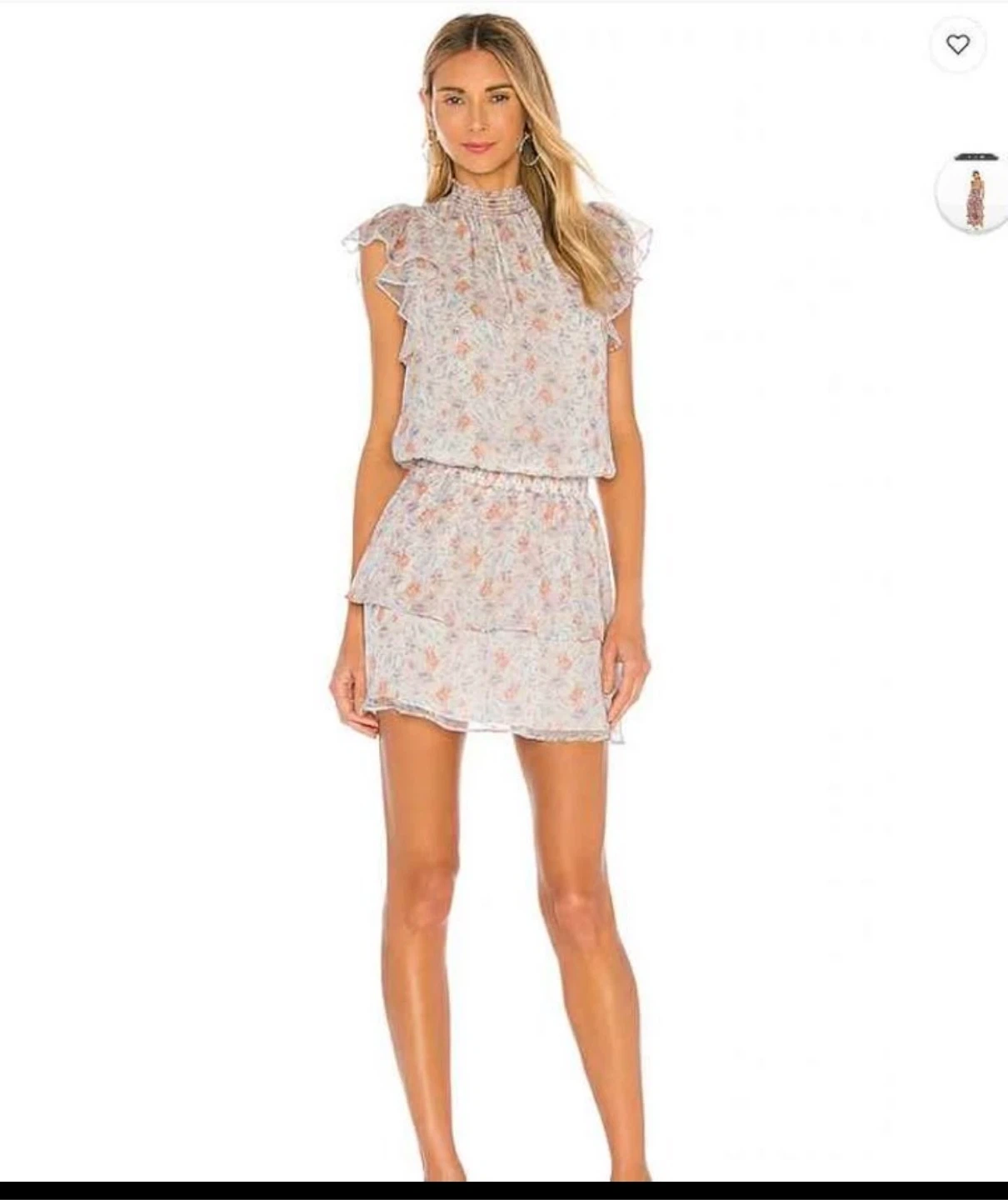 This is a lovely Love Shack Fancy mini dress. It features a floral print with ruffled details and a smocked waist. The dress is made of lightweight fabric.