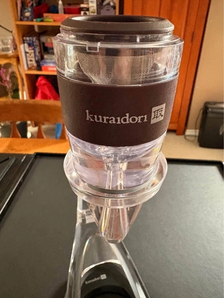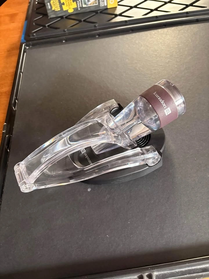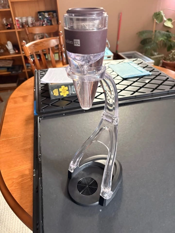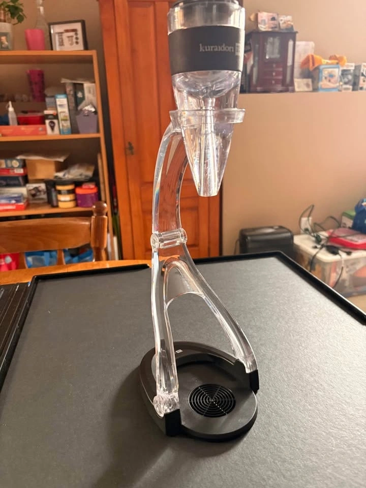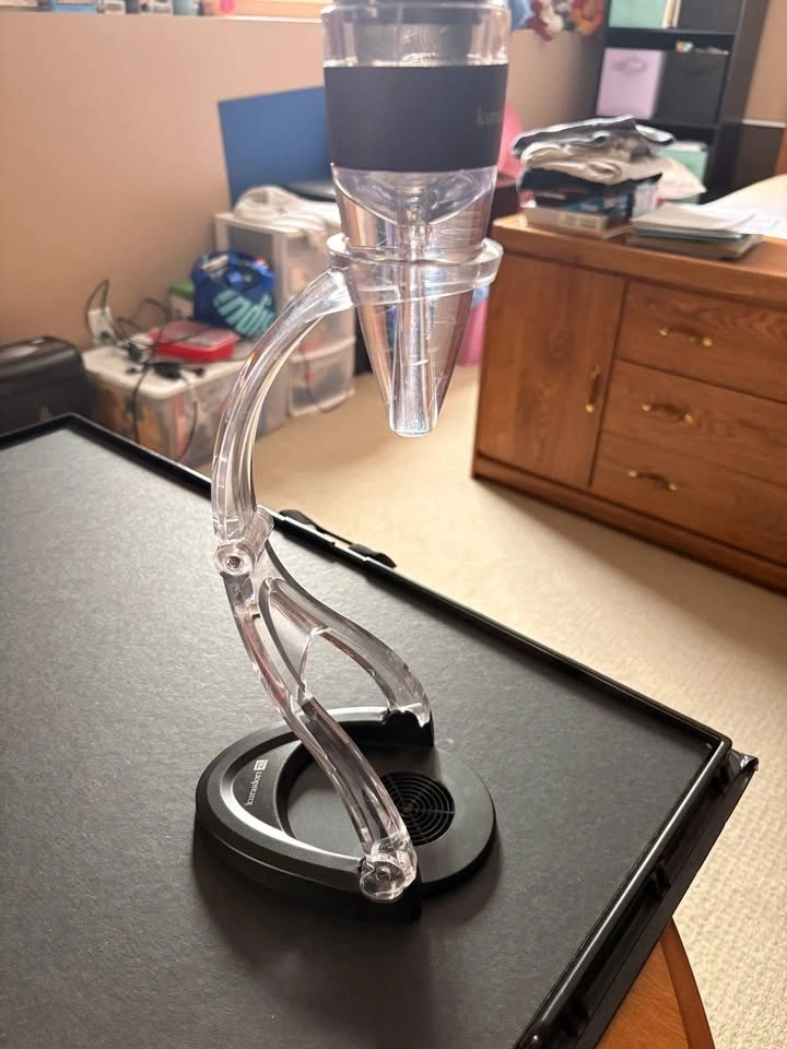 This Kuraidori Wine Aerator Stand is a popular accessory designed to hold a wine aerator for hands-free, drip-free pouring, enhancing wine's flavor and aroma. It features a foldable design for easy storage, durable construction, and a sleek black/clear aesthetic, making it a functional and stylish bar tool.