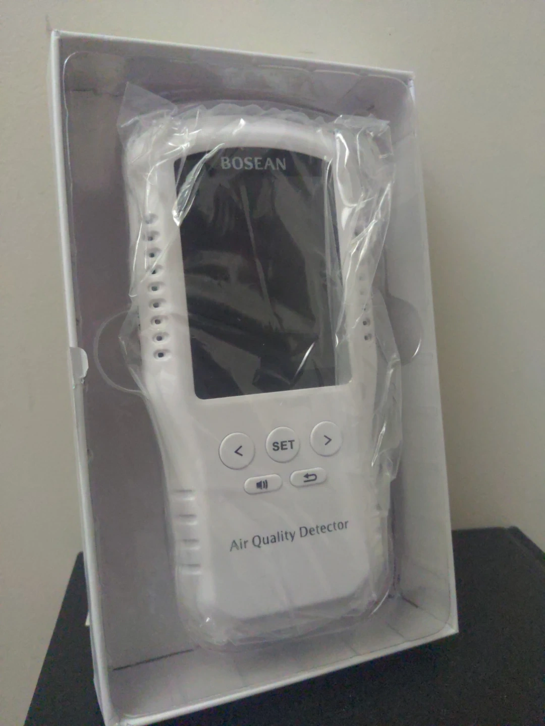 This is a Bosean Air Quality Detector. It measures HCHO, TVOC, CO, CO2, AQI, temperature, and humidity. Includes original packaging.