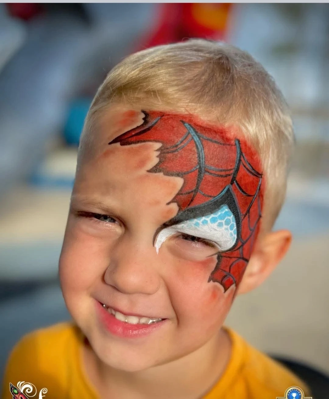 Professional Spider-Man face paint design, perfect for parties or events. Applied with safe, non-toxic paints. Adds a fun touch for any Spidey fan!