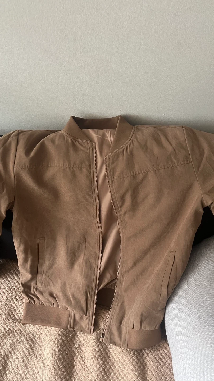 This light brown bomber jacket features a smooth satin lining and a faux suede outer shell. It's a stylish choice for everyday wear. The jacket includes ribbed cuffs and hem for a snug fit. It's made with 100% polyester.