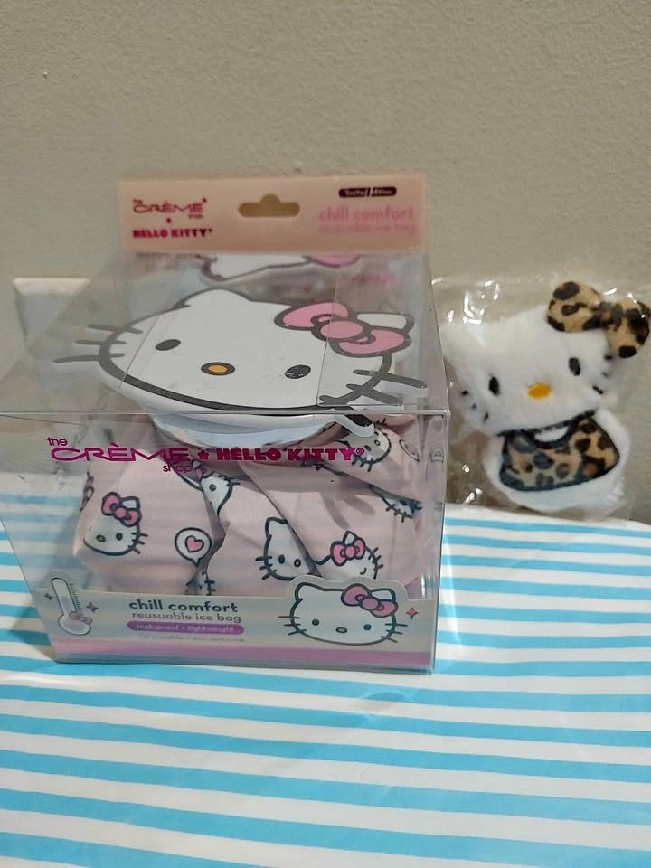 Item is a Crème Shop reusable ice bag featuring Hello Kitty.