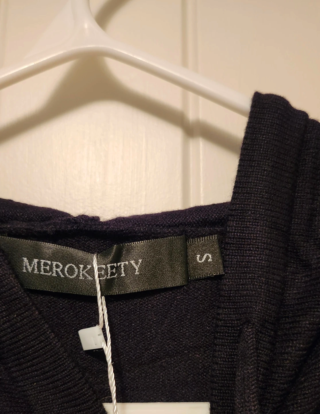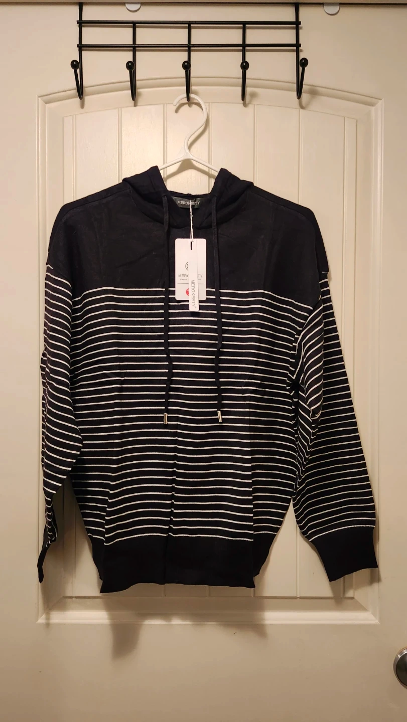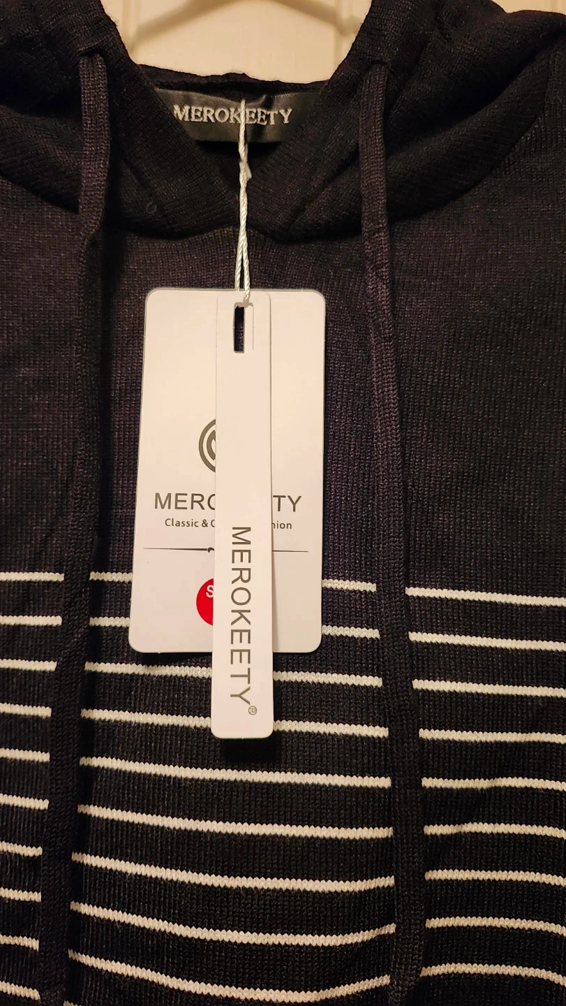 This is a MEROKEETY women's hooded sweatshirt. It's a size small and features a navy blue and white striped pattern. The hoodie has drawstrings and a comfortable knit design.